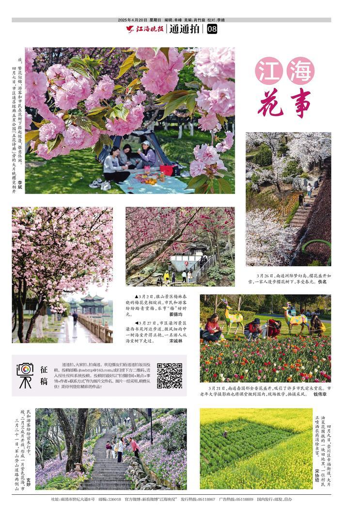 通通拍,大家拍、拍南通。欢迎摄友们给通通拍版面投稿。投稿邮箱:jhwbttp@163.com;或扫描二维码,进入报社报料系统投稿。投稿时最好以“拍摄时间+地点+事情+作者+联系方式”作为图片文件名。图片一经采用,稿费从优!期待刊登您精彩的作品!