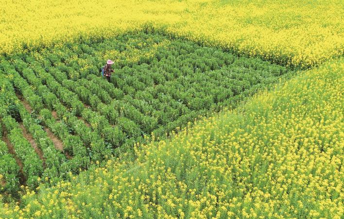 4月9日,崇川区幸福街道,大片油菜花围拢的一块田地里,一位村民正喷洒农药消除虫害。 宋协培