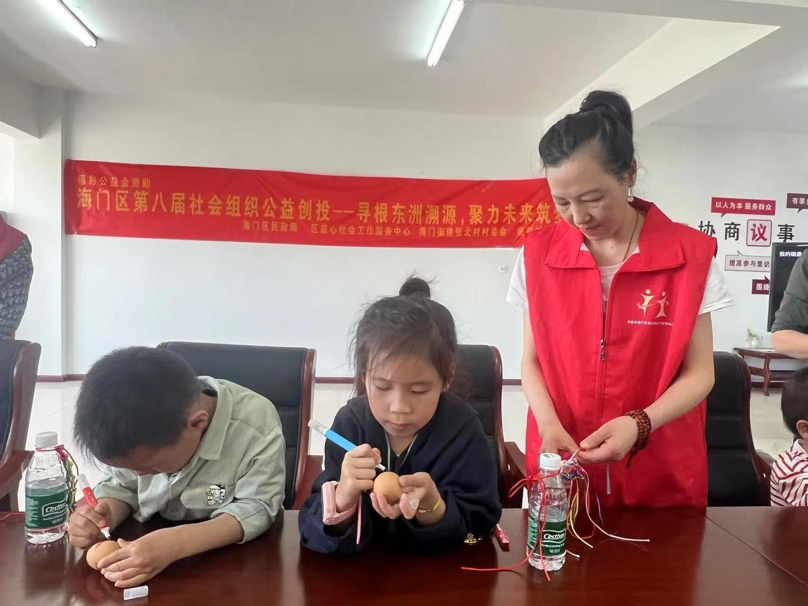 为丰富社区文化生活,增强社区凝聚力,4月20日下午,由南通市海门区民政局主办,南通市海门区益心社会工作服务中心承办,南通市海门区海门街道振邦村、张北村协办的“寻根东洲溯源,聚力未来筑梦”公益活动在海门区海门街道振邦村如火如荼地进行着......活动现场欢声笑语不断,居民们通过编织蛋袋、绘制彩蛋等互动,共赴了一场充满地域文化韵味与邻里温情的夏日之约。