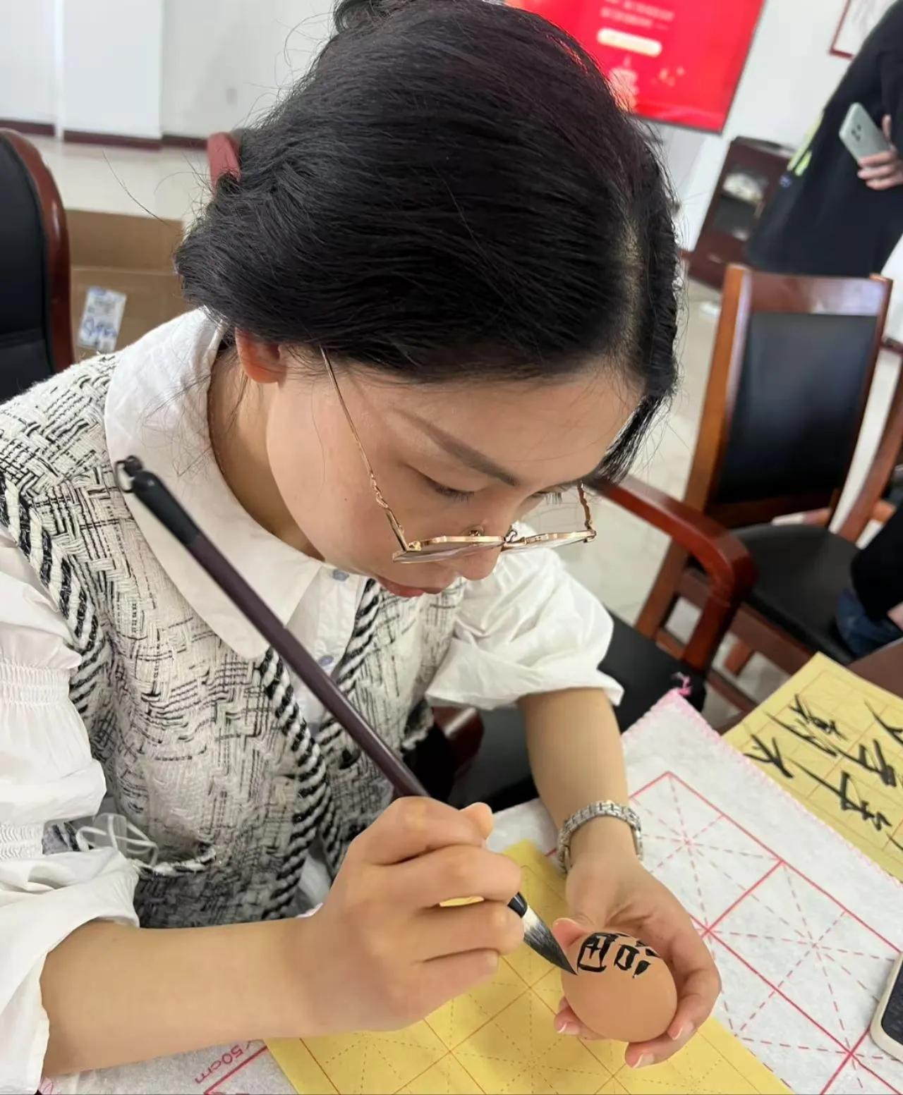 彩蛋绘制区则成了创意大爆发的舞台。小朋友们用彩笔在鸡蛋上勾勒出花草、卡通形象、祝福语等图案,原本普通的鸡蛋瞬间变身承载美好寓意的“彩蛋使者”。青年教师陶女士在蛋壳上画了“福”字样,并分享道:“希望把这份福气传递给邻居们!”