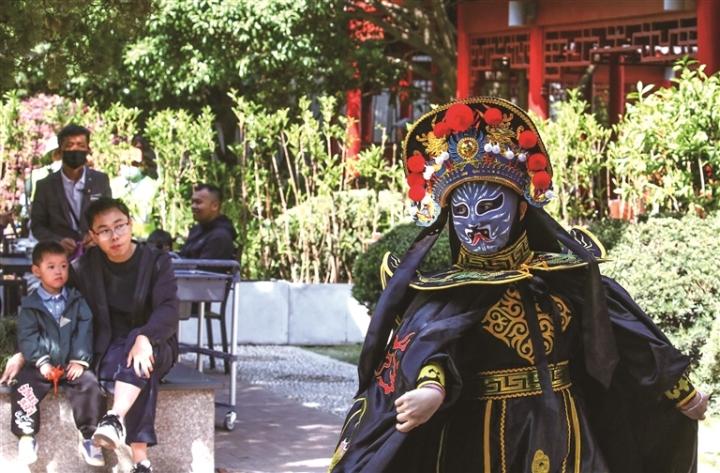 2日,海安市海陵公园一家茶室外,市民们一边悠然品味早茶,一边欣赏店家安排的非遗变脸表演,享受假日惬意时光。顾彬斌