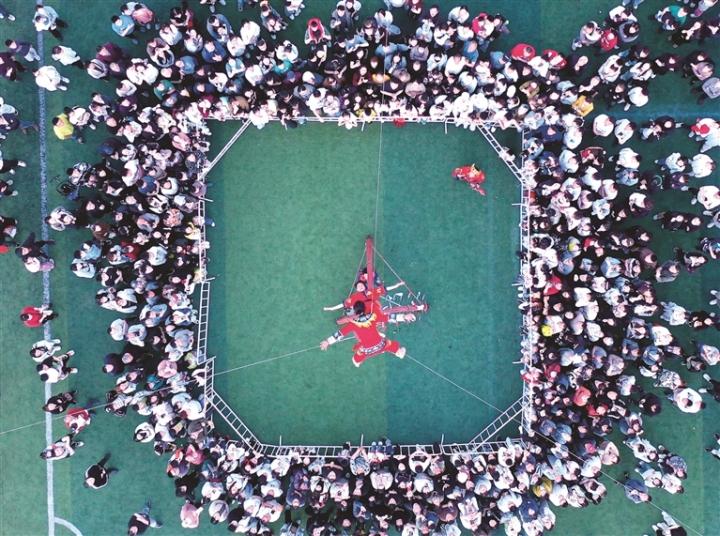 “五一”当天,南通州文旅嘉年华活动现场,一组演员表演“上刀山”,一名演员在“刀山”顶端旋转。精彩表演尽显传统杂技魅力。宋协培
