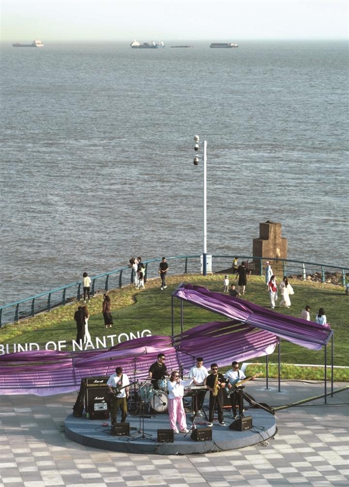 2日下午,南通滨江生态绿化带一隅,一支充满活力的乐队正在演出。市民漫步江边,或享受听觉盛宴,或欣赏美丽江景。这里俨然成为人们休闲、娱乐和健身的好去处。吴迎晨