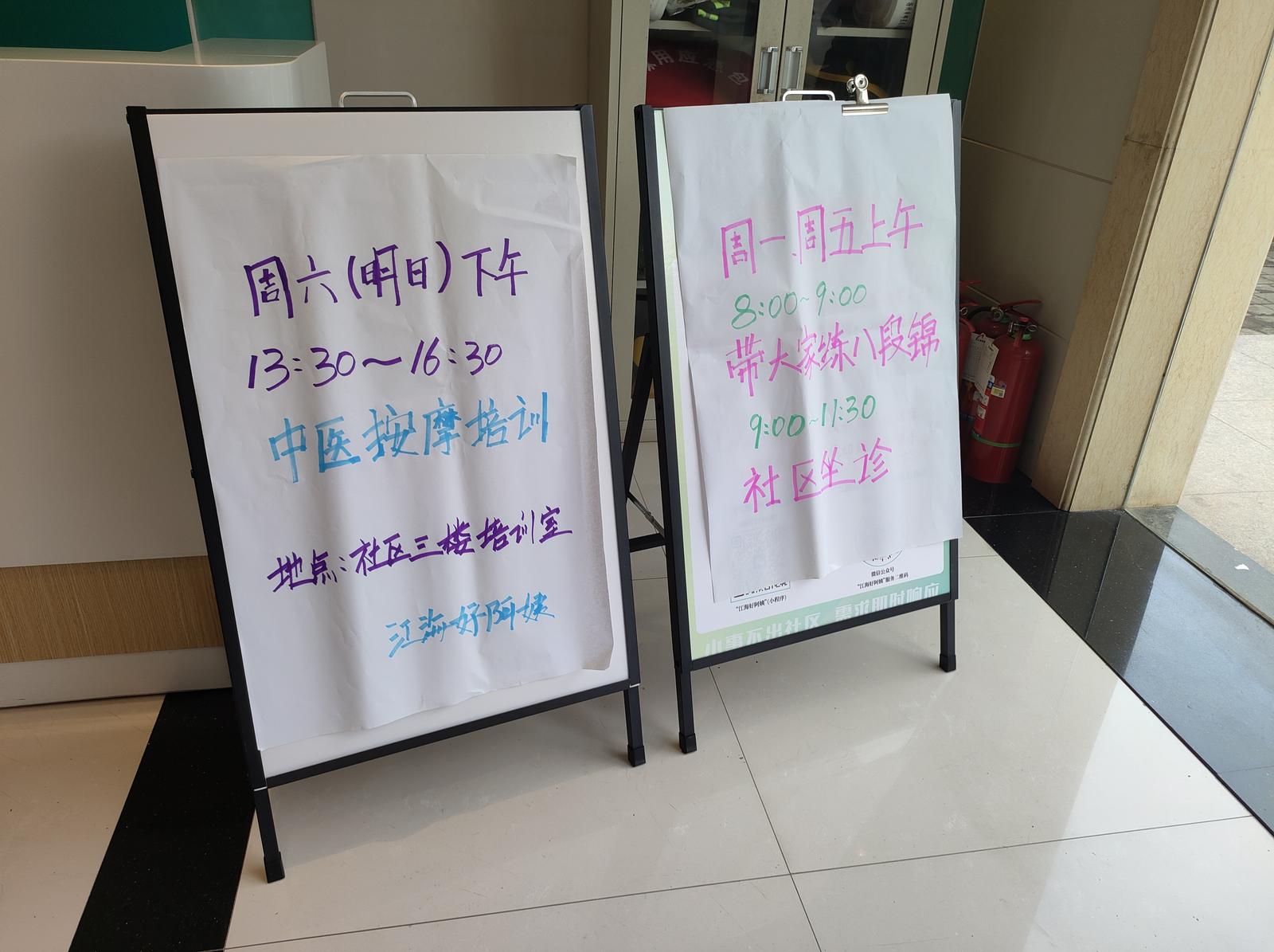 记者注意到,除了这场正在举办的培训,下周一和周五的活动安排——八段锦学习,已在驿站一楼进行了发布。“每周都有很多活动,我们可喜欢到这里来了。”参加完中医按摩公益培训后,虹桥新村的张阿姨赞叹道。