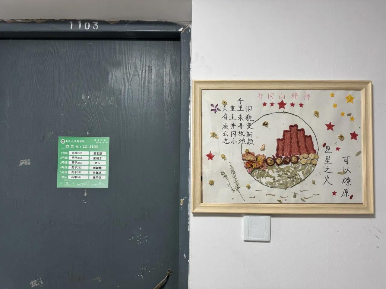 活动将传统中草药元素与红色精神相结合,以创意贴画形式展现党的光辉历程,吸引了同学们踊跃参与。 本次活动以“中国共产党人精神谱系”为主题,要求参赛者选用中草药为材料,通过剪贴、拼绘等手法创作具有象征意义的作品。同学们巧妙运用药材的天然形态与色彩,赋予红色精神生动表达:如以山楂、甘草片、枸杞拼贴出井冈山雄姿,象征坚定信念的井冈山精神;用玫瑰、碧冬茄等勾勒红岩英雄群像,致敬坚贞不屈的红岩精神……每一幅作品既展现中医药的韵味,又饱含对党的深情礼赞。 展览现场,一幅幅贴画作品整齐陈列于宿舍走廊两侧,吸引师生驻足欣赏。淡淡的药香与鲜活的画面相融,让抽象的精神谱系变得可触可感。