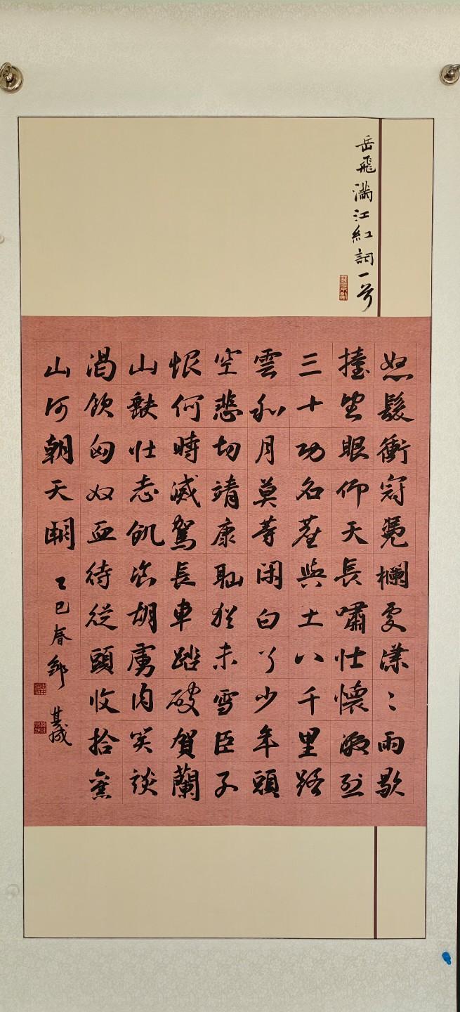 步入展厅,扑面而来的是浓厚的传统文化气息。展区内,书法作品笔力虽显青涩却不失灵动,绘画作品色彩斑斓且意境深远。小作者们或挥毫写下“大漠孤烟直,长河落日圆”的雄浑壮阔,或用丹青描绘“青山碧翠荷塘绿,戏水欢歌锦鲤藏”的轻快灵动,将诗词中的场景与情感一一呈现。六年级学生杜茜榕用篆书书写的《将进酒》,字迹苍劲有力,将李白的洒脱豪放之情凝于笔端。杜茜榕介绍道:“李白是我很喜欢的一位诗人,我花了九个小时才写好这篇作品,很累但也很有成就感。”