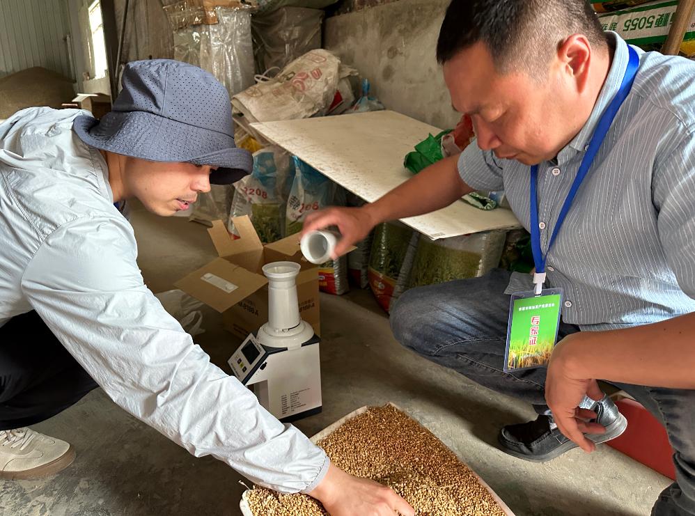 现场,技术人员根据《主粮作物机收损失监测调查测定方法》要求,就地选择一块样田,随机选取采样点、划分采样区,做好调查记录。通过现场收割、取样、称重等环节,将面积、产量、水分等数据代入公式,测算小麦机收损失率。