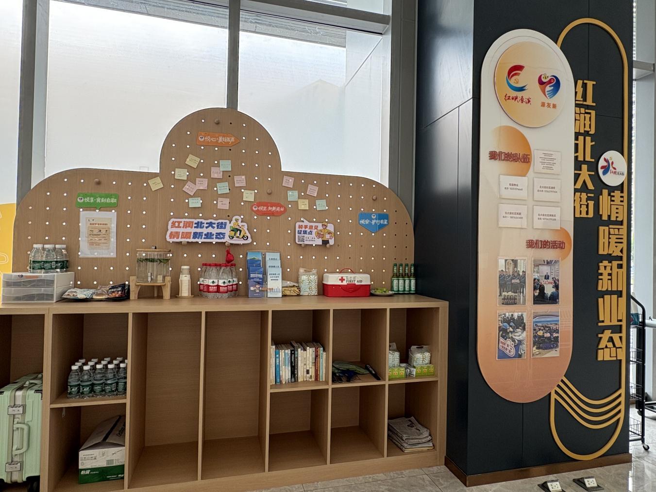 特别在华润悦玺大厅,针对日均超百人次外卖小哥的集聚需求,专门开辟休憩区域打造暖“新”驿站,配备药箱、饮用水、雨衣、充电设备及外卖临时存放区,将服务送到小哥“脚边”。同时,创新盘活闲置资源,将原有核酸采样亭改造为集城市管理与骑手服务于一体的多功能“暖新驿站”,增设饮水机、微波炉、充电宝等,实现“即停即享”。