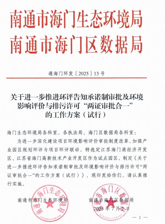为持续优化营商环境,提升审批服务效能,推动环评、排污许可、总量控制等制度衔接,海门生态环境局结合海门发展实际,联合海门区数据局于今年7月率先制定并印发《关于进一步推进环评告知承诺制审批及环境影响评价与排污许可“两证审批合一”的工作方案(试行)》。