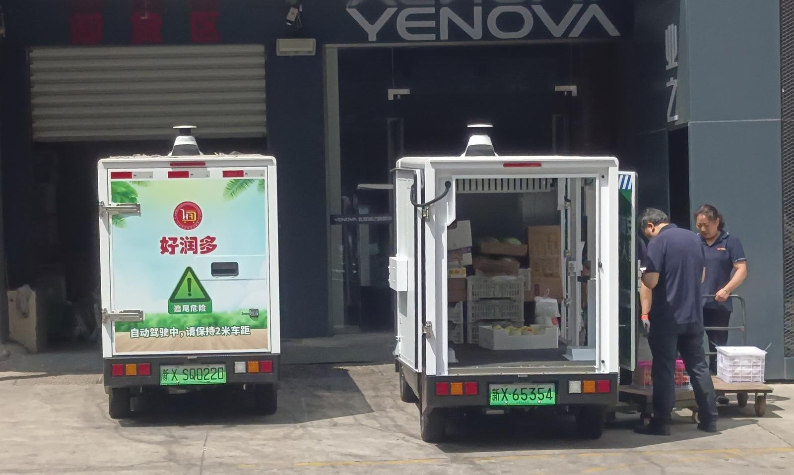 目前,像这样忙碌的无人车,海安首批上路了50辆。它们穿梭在商超与门店之间,奔波于餐馆和企业食堂,有的还穿过小道把快递送到镇村……