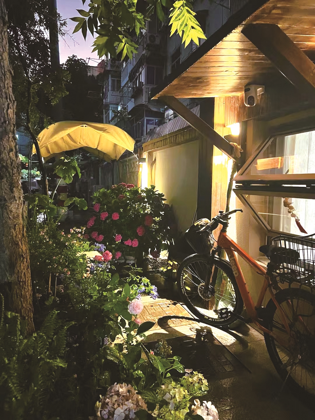 绕过大门,从小区的镂空花墙向里望去,不经意间,发现令人怦然心动的一幕。一楼有户人家,在家门口一块小小的空地上,竟然打造了一个别致的小花园。暖黄的灯光晕染下,粉色月季开得正盛,蓝色的鸢尾花在风中轻摇。门口还停着一辆橘黄色赛车,让人想象着少年骑行的样子,衣摆向后鼓得像个降落伞,满身散发着希望的光芒。