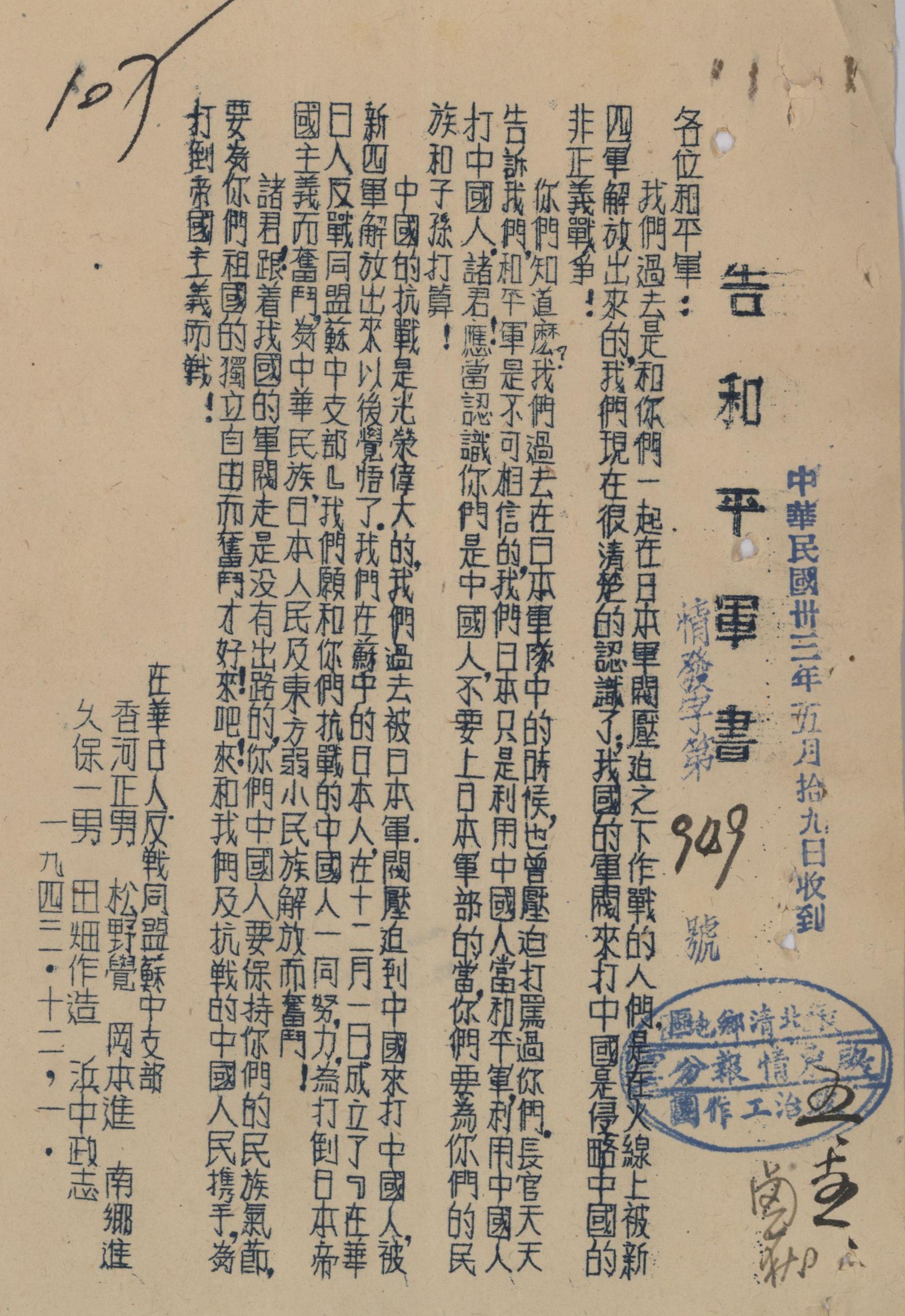 松野觉自己学会了油印,而那时用的钢板蜡纸都是日本造的崛井牌,印出的宣传单十分精美。在南通市档案馆里,胡磊戴着防尘手套,小心翼翼地为我们调取出了当年由松野觉印制的一张珍贵的宣传单,这张已经泛黄的宣传单上清晰地印有《告和平军书》的全文内容:“我们过去是和你们一起在日本军阀压迫之下作战的人们,是在火线上被新四军解放出来的,我们现在很清楚地认识了:我国的军阀来打中国是侵略中国的非正义战争!”“中国的抗战是光荣伟大的,我们过去被日本军阀压迫到中国来打中国人,被新四军解放出来以后觉悟了。”“来吧!来和我们及抗战的中国人民携手,为打倒帝国主义而战!”……
