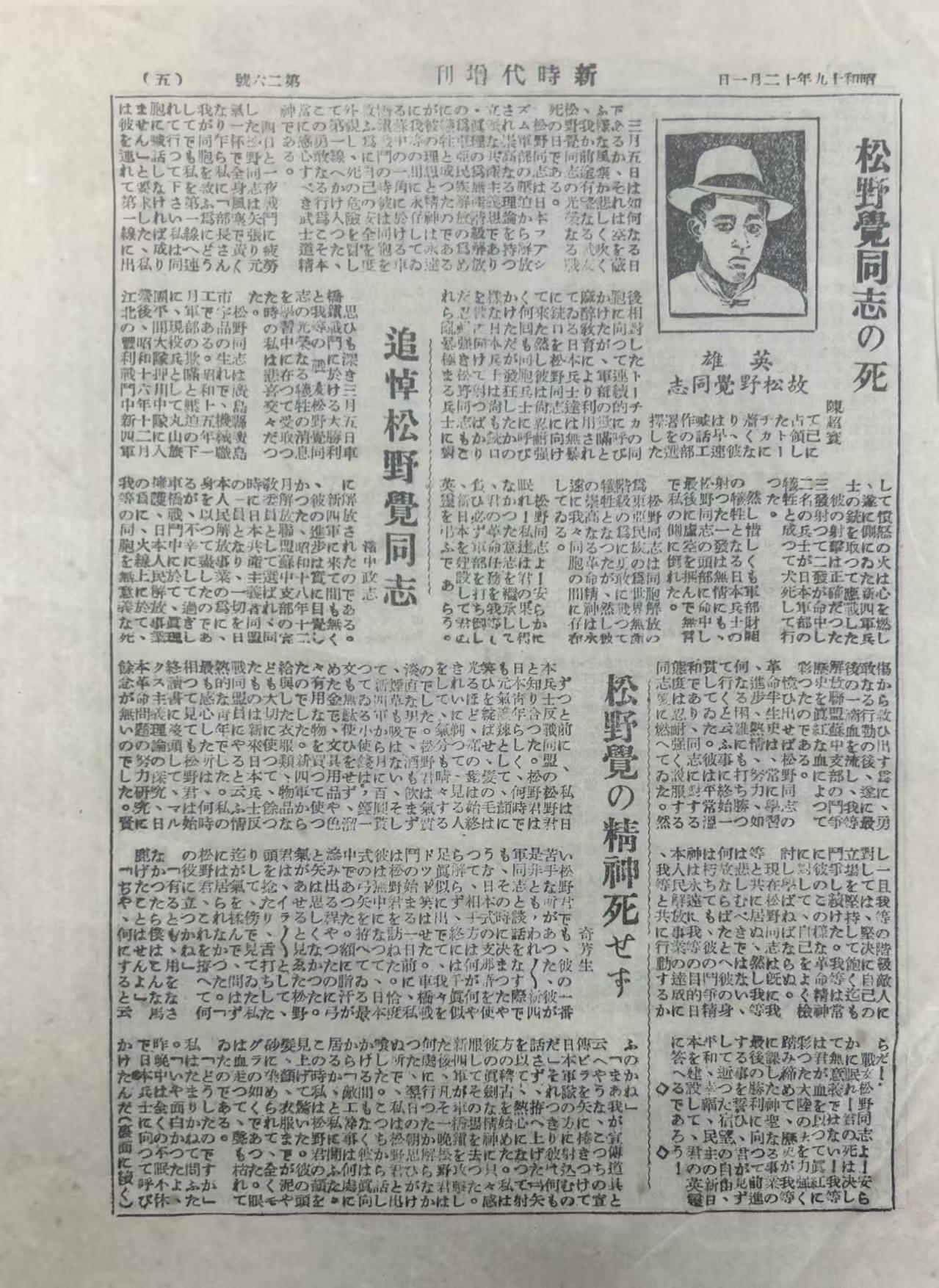 头版刊登了陈超寰(中国)的《松野觉同志之死》、滨中政志(日本)的《追悼松野觉同志》、奇芳生(中国)的《松野觉的精神不死》三文,二版载冈崎周治(日本)的《呜呼,沉默无言的指导者》和陈结山(朝鲜)的《我的回忆》两文。头版第一篇文章的前面印有松野觉头戴礼帽、身穿便服的头像,下有“英雄故松野觉同志”两行字。从作者的身份来看,两篇作者是中国人、两篇作者是日本人、一篇作者是朝鲜人。五篇文章都是文字简洁、感情深厚,大体将松野觉的形象描绘出来了。
