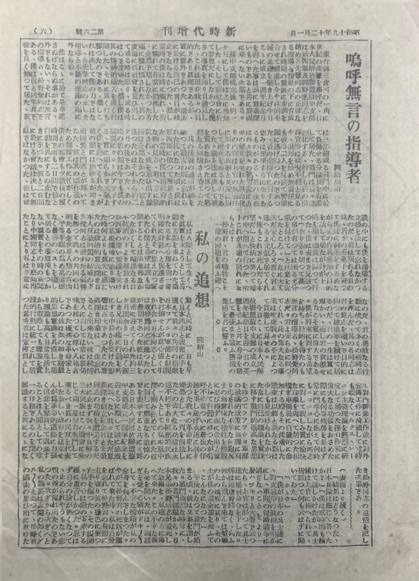 有一份珍贵的铅印日文报纸,藏于如东县档案馆已80多年(上图↑)。经南通市档案馆宣教处副处长胡磊引荐,我们见到了这份珍贵的日文报纸——《新时代》增刊报第二十六号,时间为公元一九四四年十二月一日,版面为八开,两版,这期的内容都是纪念在华日人反战同盟战士松野觉的文章。