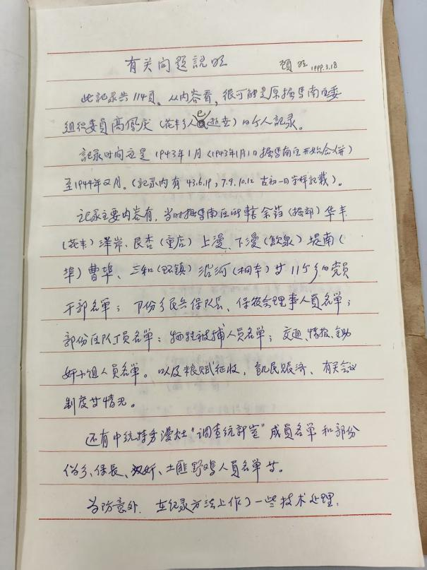 “在如东县档案馆馆藏中,有这样一份特殊的档案——如东县政法委原书记顾明捐赠的,掘马南区区委组织委员工作记录、复制件和捐赠说明。这份档案记录了1943年1月至1944年2月期间,白桐本区长领导下的掘马南区党员干部名单、牺牲被捕人员名单以及粮赋征收、赈济等情况……”如东县档案馆资源建设科科长何丹丹翻开这份历史物件,向我们诉说起那段浴血奋战的家国情怀。