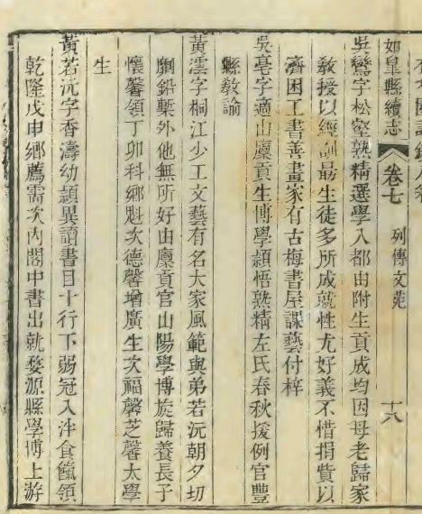 黄我石七世祖黄景修“文行卓卓”;其九世祖黄嘉燕,赠贡生,“受知于督学谢,有声庠序”。黄我石祖父黄心泉,捐田兴修书院;伯父黄桐江,为山阳县教谕。黄我石父亲黄若沅(1761—1817),字湘涛、约亭,号楚帆,江南戊申科举人,补安徽婺源县训导,候补内阁中书。黄若沅善诗,著有《是亦山房诗古文词》四十卷。他向往孤山,曾作《游西湖不果》,留下佳句:“林逋三百树,回望白云稠。”他还精通弈理,名扬京都,群推国手。清朝围棋高手潘星见,一度客居如皋数月,杜门不出,专与黄若沅探讨棋艺。黄若沅又好收藏,“每遇院试及省试,必购异书法帖、彝鼎法物,聚集双桂轩”。黄我石尽管幼年失怙,不过家学渊源、家藏丰富,为其成为印人,营造出浓厚的文化氛围。下图左:清末刻本《如皋县续志·黄若沅传》书影,右:朱霖诗作《挽黄我石》。