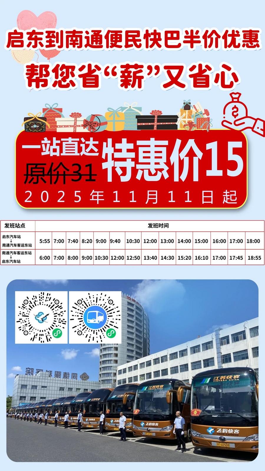 11月3日,记者从启东汽车站获悉,自11月11日起,启东汽车站往返南通汽车客运东站的票价将由原价31元降至15元,进一步实现两地便捷往返。