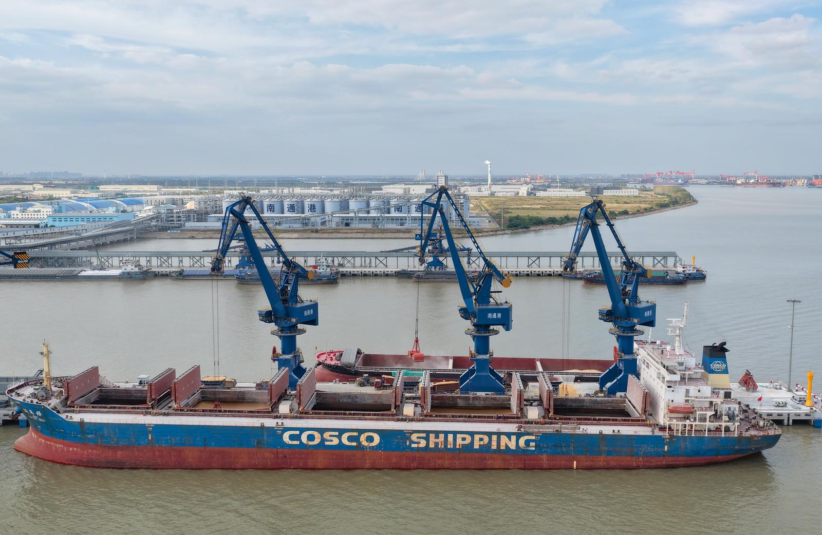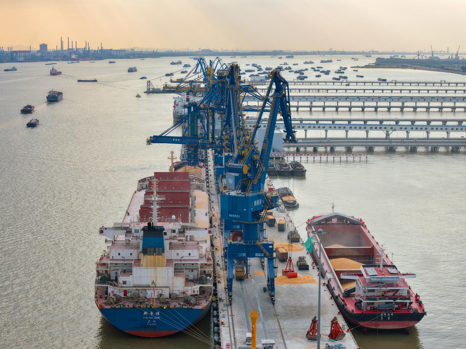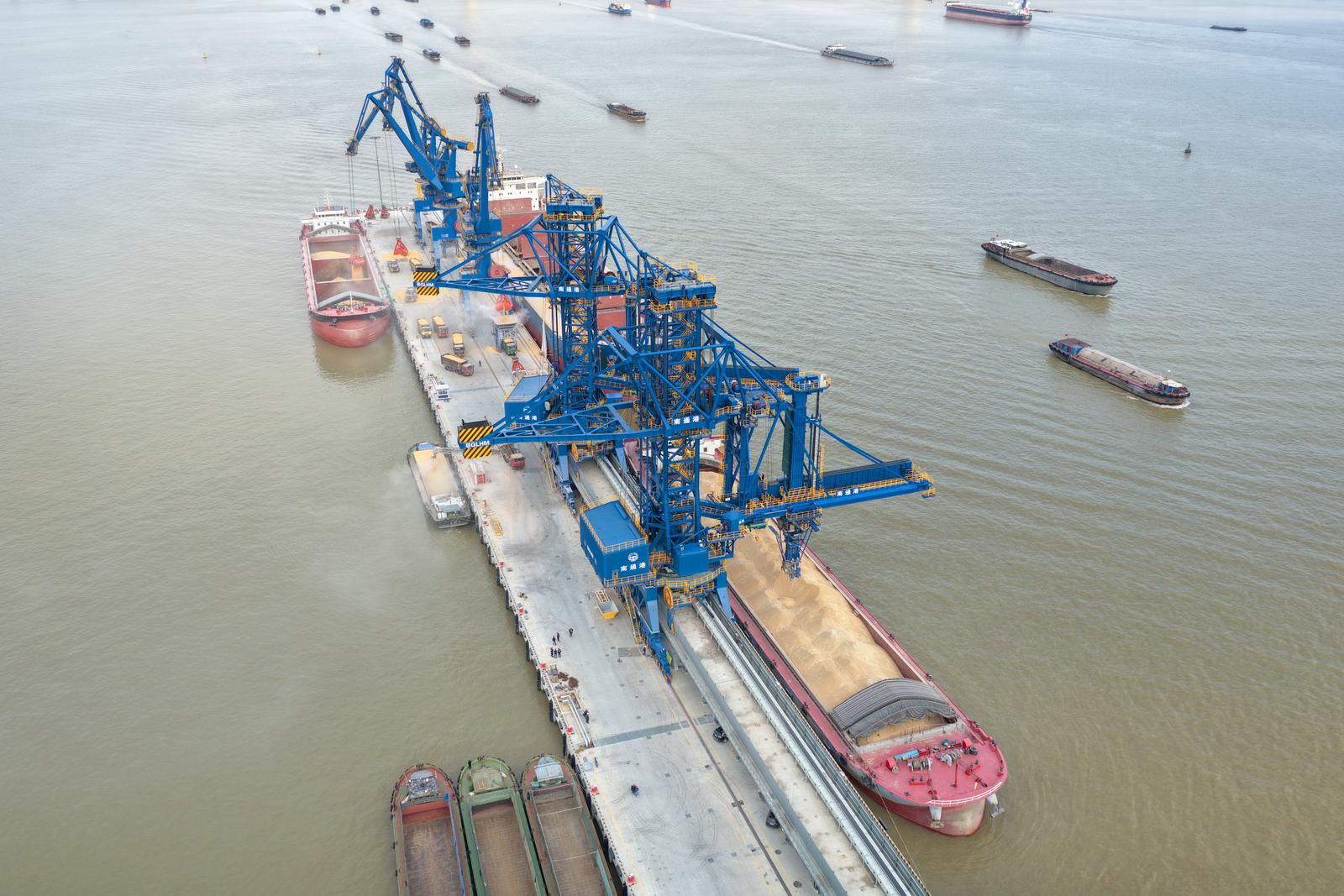2025年11月3日拍摄的忙碌的南通港天生港区横港沙作业区10万吨级粮油码头。 这个10万吨级粮油码头是长江干线最大的粮油专用码头,建设10万吨级、3万吨级泊位各1个,5000吨级泊位7个,设计年通过能力1180万吨。可接靠进口粮食、内贸粮食的主力船型,食用油年吞吐量可达80万吨,并可依托二线5000吨级泊位提供方便快捷的中转运输。