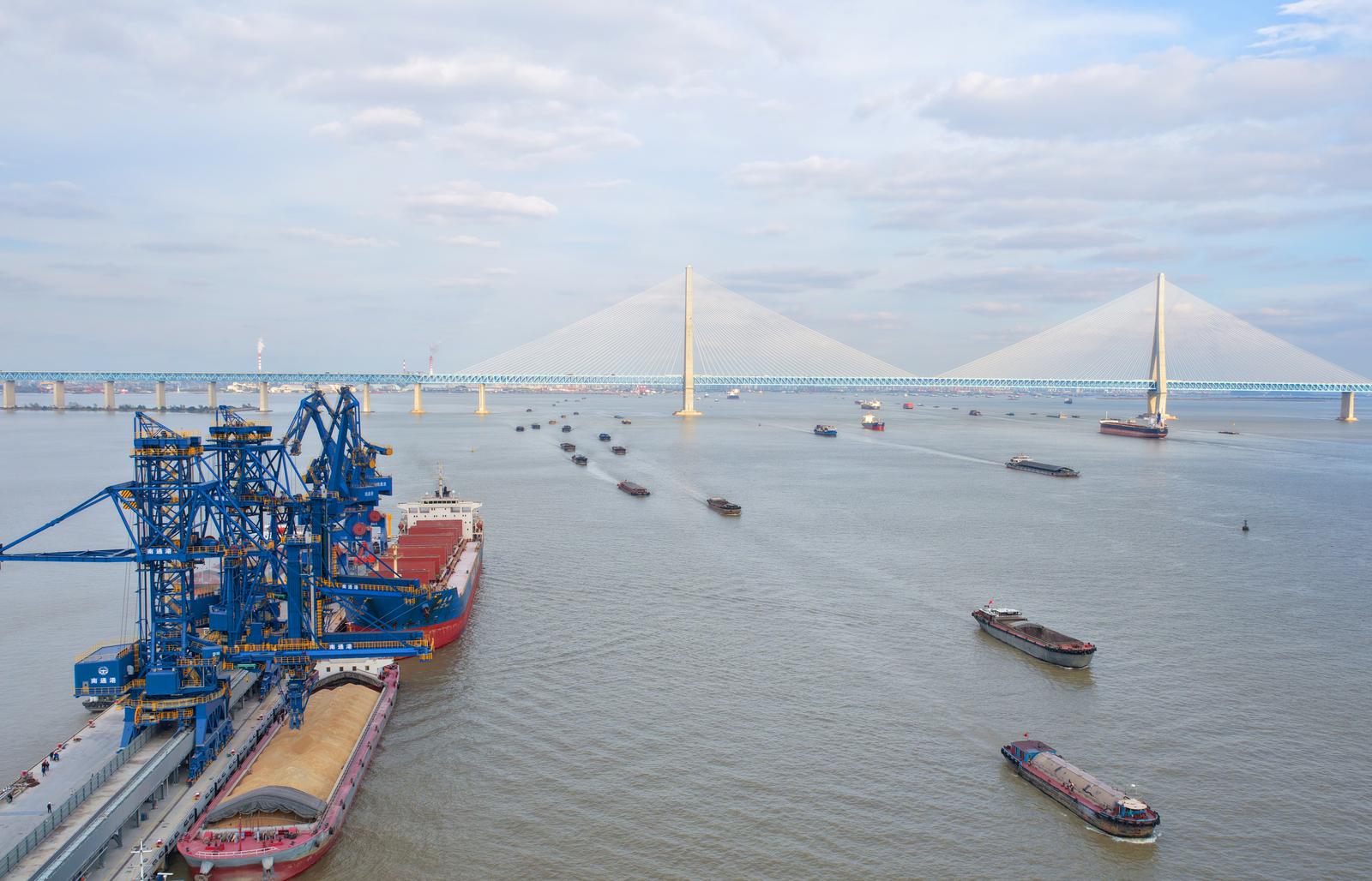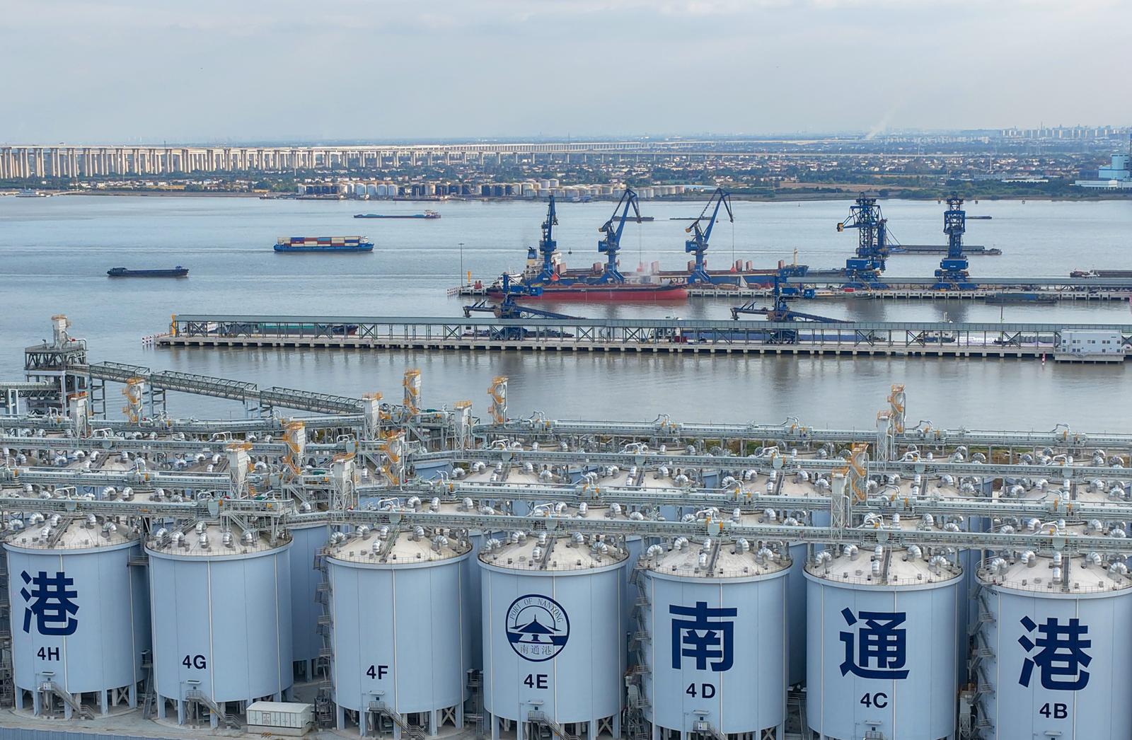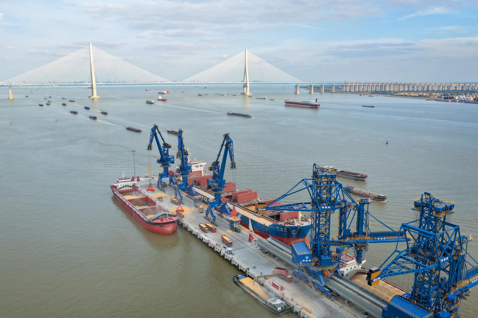 2025年11月3日拍摄的忙碌的南通港天生港区横港沙作业区10万吨级粮油码头。 这个10万吨级粮油码头是长江干线最大的粮油专用码头,建设10万吨级、3万吨级泊位各1个,5000吨级泊位7个,设计年通过能力1180万吨。可接靠进口粮食、内贸粮食的主力船型,食用油年吞吐量可达80万吨,并可依托二线5000吨级泊位提供方便快捷的中转运输。