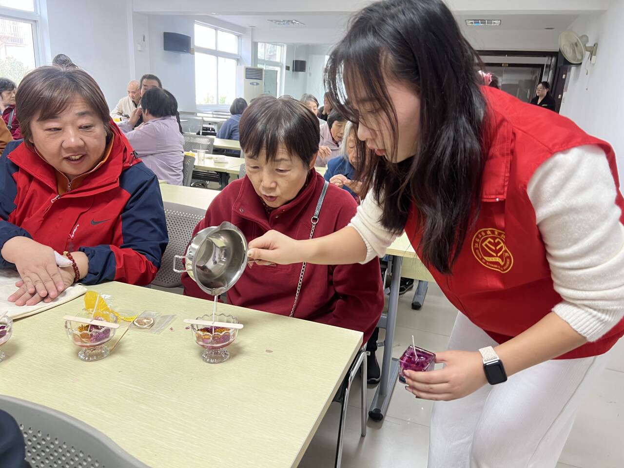 活动尾声,大家一同分享象征吉祥与祝福的糕点。香甜的糯米气息与方才的烛香交织在一起。大家品尝着软糯的糕点,交流着身边的趣事,欢声笑语不绝于耳。这份甜蜜,不仅润在唇齿,更暖在心间,将志愿者、社区工作者与老人们的心紧密相连。