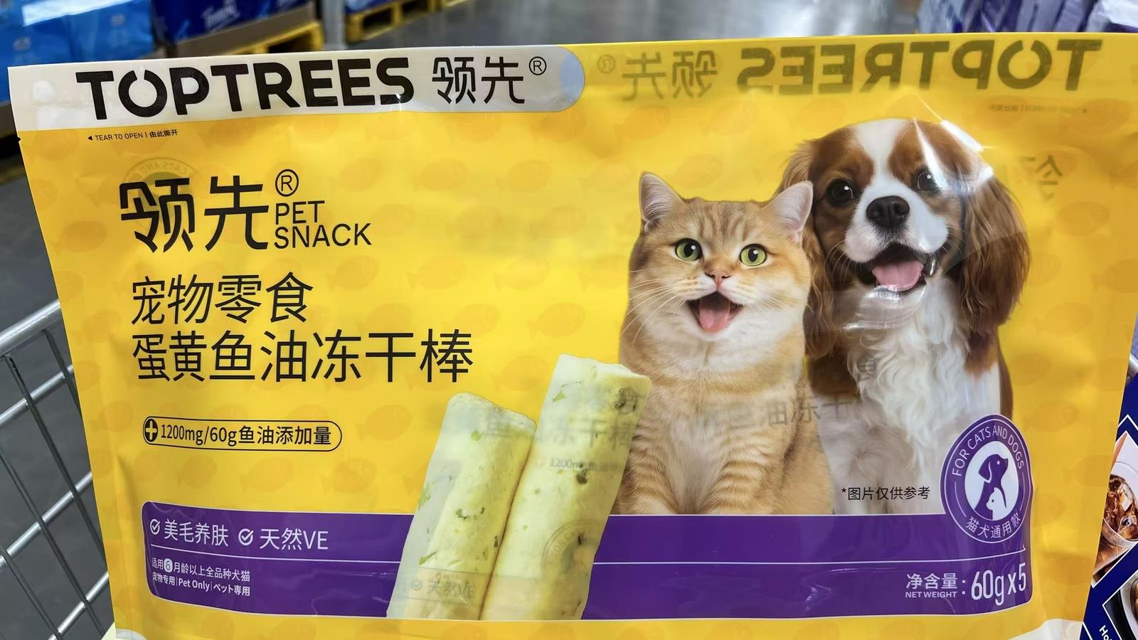 在山姆会员商店二层的宠物专区,禽肉烘焙粮、鸭肉干、羊奶粉、营养膏、兔肉冻干等商品吸引了不少顾客。养宠人李嘉云推着满载的购物车感慨:“来这儿必逛宠物区!这些都是我回购多次的好物。”她时常会参考小红书上的“必买清单”,采购酸奶、冷冻莓果、鱼类等人宠可共享的食材。