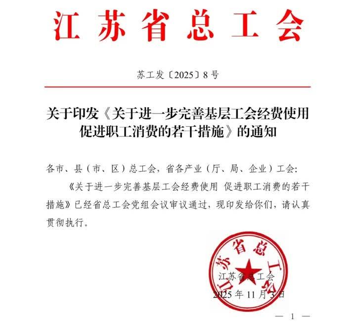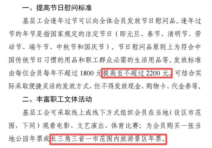 近日,江苏省总工会印发了《关于进一步完善基层工会经费使用促进职工消费的若干意见》的通知,其中明确职工节日慰问品发放标准由每位会员每年不超过1800元提高至不超过2200元。