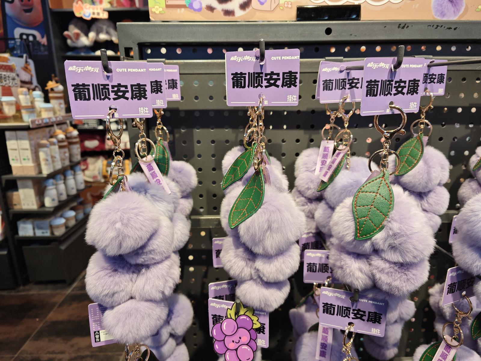 酷乐潮玩门前,“交个萌友”系列展陈醒目。两只猫咪玩偶挂件格外引人注意——它们不仅造型可爱,还暗藏巧思。“它的尾巴可以拉出来,会自动缩回去,”店员演示着这款互动设计,“很多小朋友一玩就放不下。”除了这类趣味设计,门店内“樱有尽有”“葡顺安康”等融合水果造型与吉祥话挂牌的文创挂件,也以其美好寓意受到各个年龄层消费者的青睐。