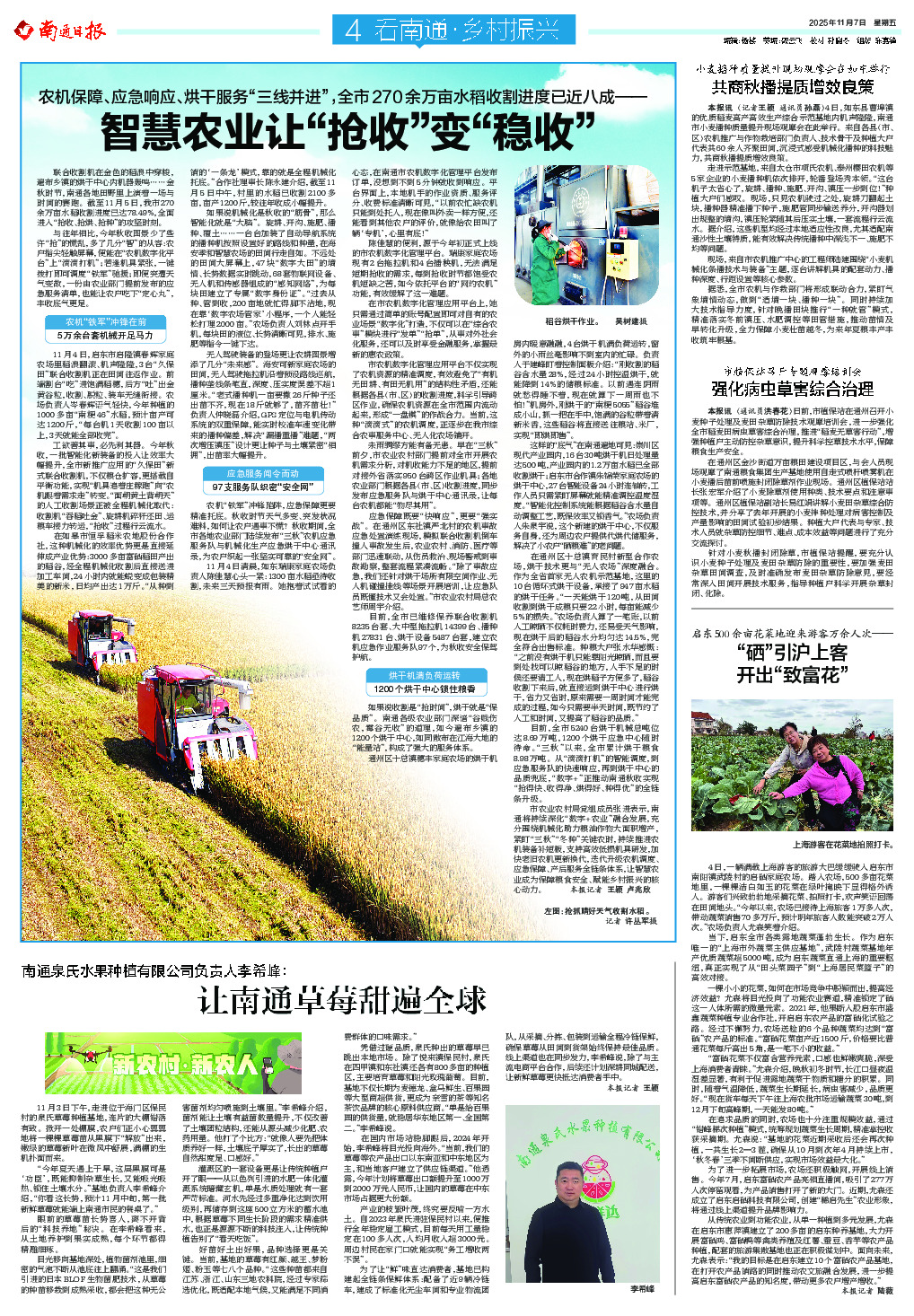 市农业农村局党组成员张进表示,南通将持续深化“数字+农业”融合发展,充分围绕机械化助力粮油作物大面积增产,紧盯“三秋”“冬种”关键农时,持续推进农机装备补短板,支持高效低损机具研发,加快老旧农机更新换代,迭代升级农机调度、应急保障、产后服务全链条体系,让智慧农业成为保障粮食安全、赋能乡村振兴的核心动力。