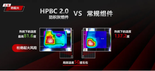 Hi-MO X10 “三防组件” 采用行业先进的HPBC2.0技术,从原理上减少热斑效应的产生。经实验室测试与户外实测验证,同等条件下,Hi-MO X10 “三防组件” 的遮挡处温度不超过100℃,而常规TOPCon组件温度易突破160℃,可见其日常应用中的 “热斑” 风险显著更低。