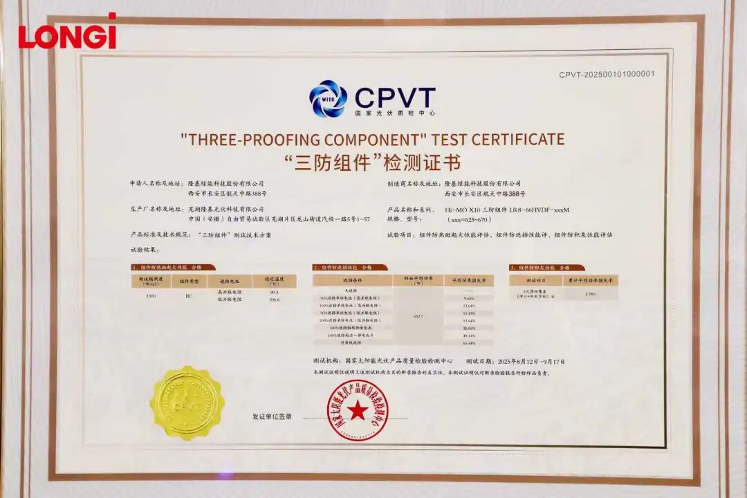 同时,组件创新性采用防积灰边框设计,通过结构优化实现雨水自清洁,既降低了热斑发生概率,又减轻了后期运维负担,成为工商业屋顶光伏电站的理想选择。更值得关注的是,隆基 “三防组件” 是全球唯一获得 CPVT(国家光伏质检中心)“三防组件” 检测证书的产品,这一认证标志着其安全性能达到行业顶尖水平。
