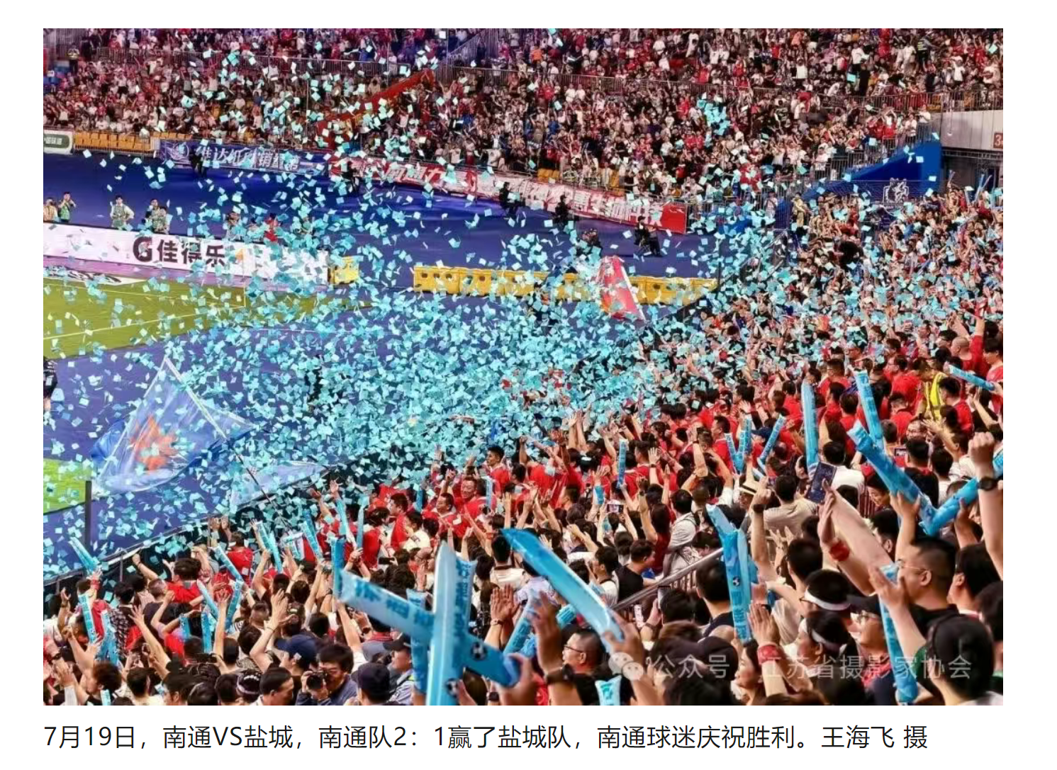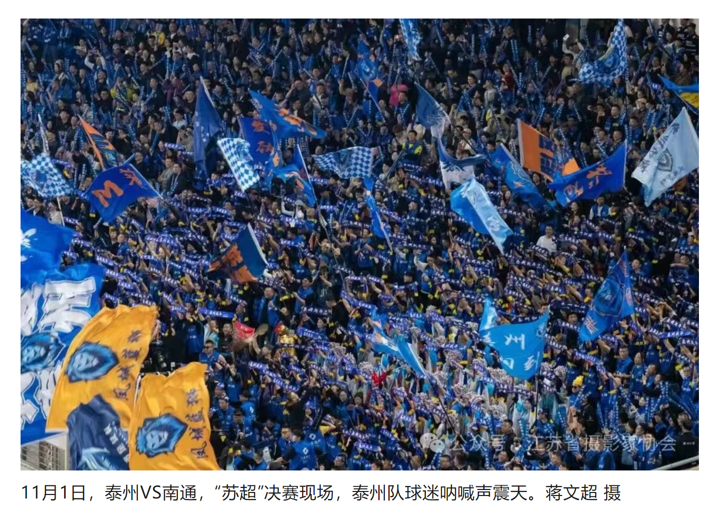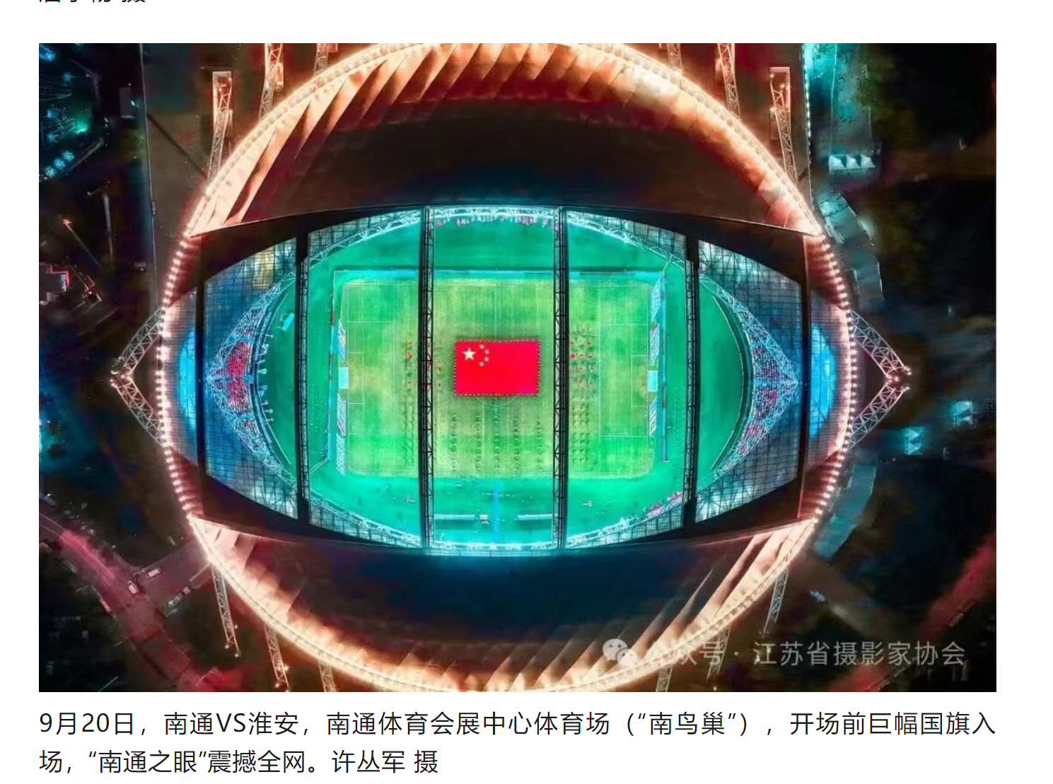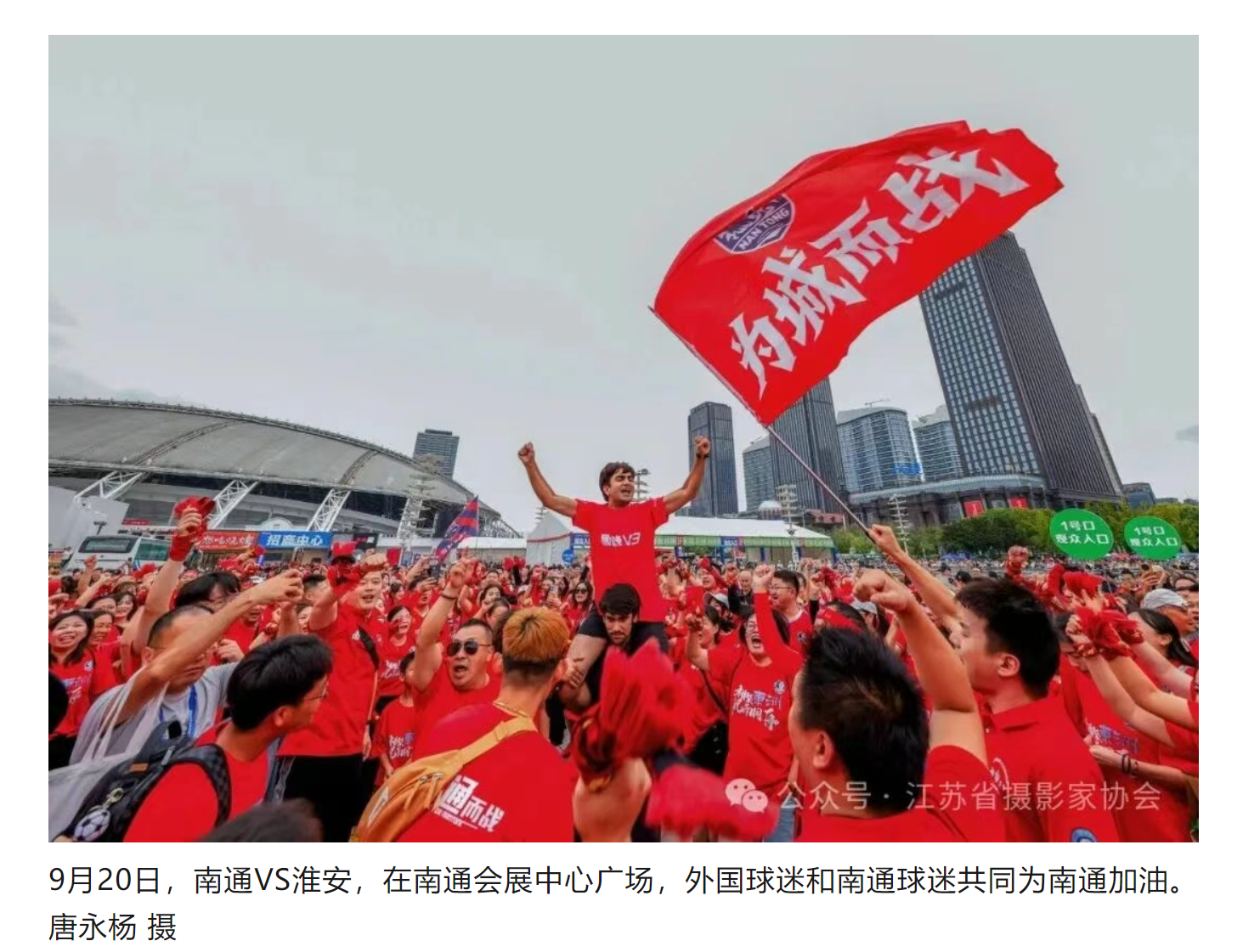 11月7日,江苏省摄影家协会官网公布“苏超”优秀摄影作品展入展名单,南通摄影人和省内摄影人拍摄的南通元素图片占百幅作品四分之一,南通报业传媒集团两位记者拍摄的“南鸟巢”巨幅国旗入场“南通之眼”、球迷专列和南通VS淮安比赛精彩瞬间3幅作品入选。