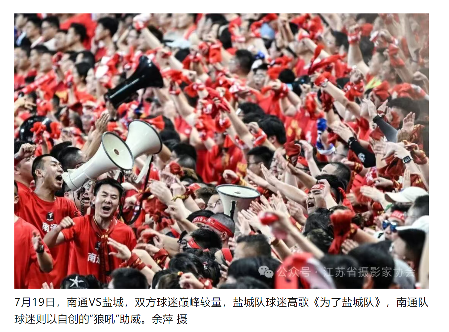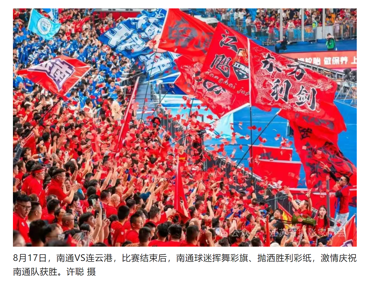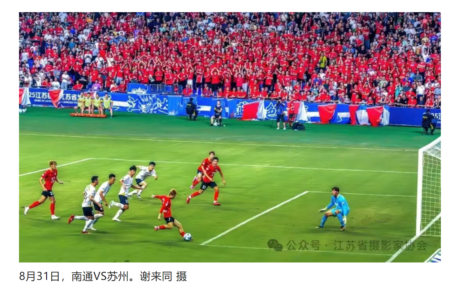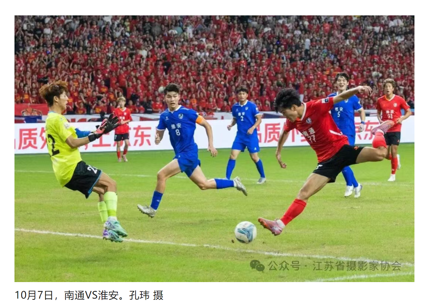 11月7日,江苏省摄影家协会官网公布“苏超”优秀摄影作品展入展名单,南通摄影人和省内摄影人拍摄的南通元素图片占百幅作品四分之一,南通报业传媒集团两位记者拍摄的“南鸟巢”巨幅国旗入场“南通之眼”、球迷专列和南通VS淮安比赛精彩瞬间3幅作品入选。