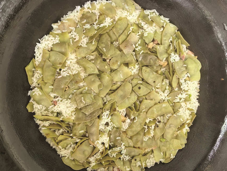 当铁锅里热出青烟时,我先倒上菜油,又加上一勺猪油提鲜。当猪油和菜油融为一体时,随着“嗞啦”声,肉丁和姜末下锅,爆炒至金黄,再把扁豆倒进锅,一起翻炒。等扁豆从深青褪成淡青,添上适量的清水,然后将大米倒入锅中,加入适量的精盐,再用铲刀搅拌至均匀后盖锅。