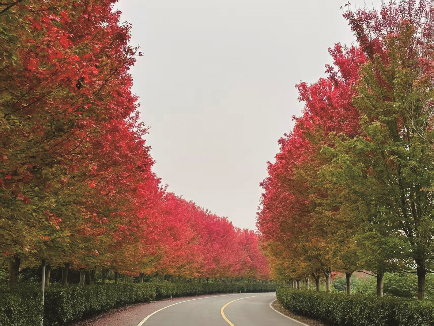 车过枫彩漫城,扑入眼帘的色彩河流令人瞬间惊呼——上万棵当地培育的“新世界枫”沿着国道两侧,从眼前一直蜿蜒到天边。这两侧的行道树就像无数把燃烧的火炬一样,点亮了略微萧瑟的秋景。
