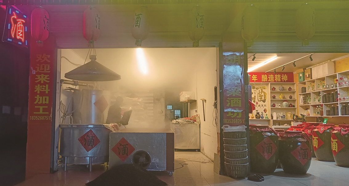香味哪儿来的呢?往回走了几步,我终于发现从超市东隔壁的高粱酒坊里弥漫出一阵阵氤氲的蒸气,浓郁的香味正飘散开来。酒坊老板挥舞着一把大铁铲,将刚蒸熟的高粱从一个大蒸锅里抄到一旁的大平台上。我好奇地询问老板酿酒的工序,老板操着浓重的外地口音热情地告诉我,把这些蒸熟的粮食晾凉之后,装入大缸里发酵,等待一定时日,就可出酒了。