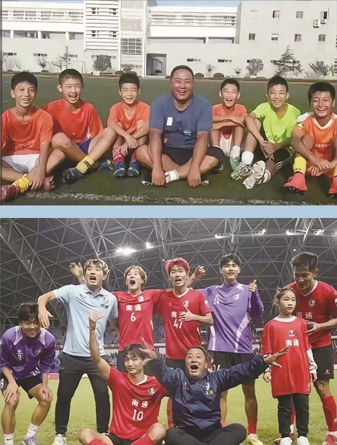 这是我认为所有“苏超”题材中最好的一张图。上面是最初的样子,李太镇和他的孩子们坐在小镇的塑胶场地上,彼时的他们并不知道未来会怎样。但是,他们所有人笑得那样自然,满眼都是光。终于,他们一起坐到“南鸟巢”的穹顶下,十四年的光阴在这一刻只凝成两个字,值得!