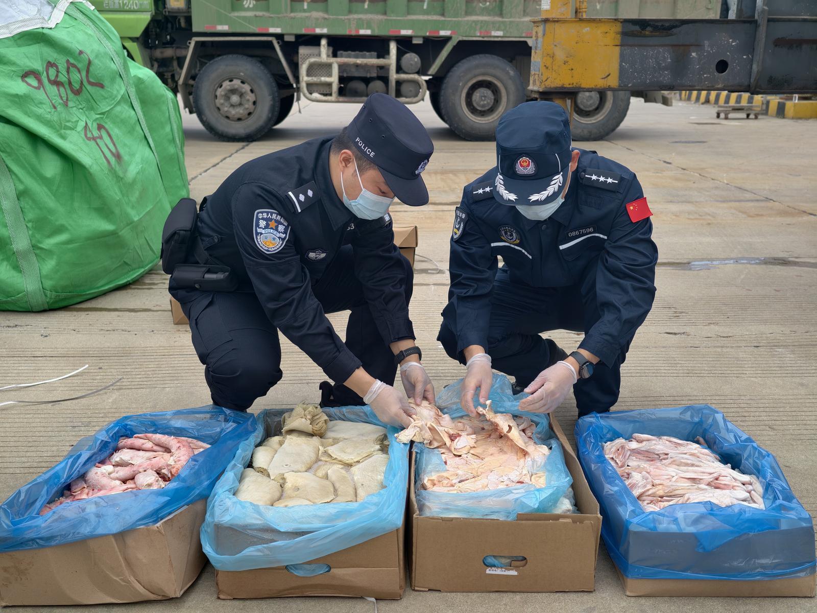 11月5日23时,在获取关键涉案线索后,如东边检站迅速启动联勤协作机制,与南通海警局如东海警工作站同步响应,开展联合收网行动。执法人员登临目标船舶后,第一时间控制驾驶室、机舱等关键部位,随后对货舱进行全面检查,当场查获大量无合法来源证明的牛杂冻品。目前,案件正在进一步侦办中。