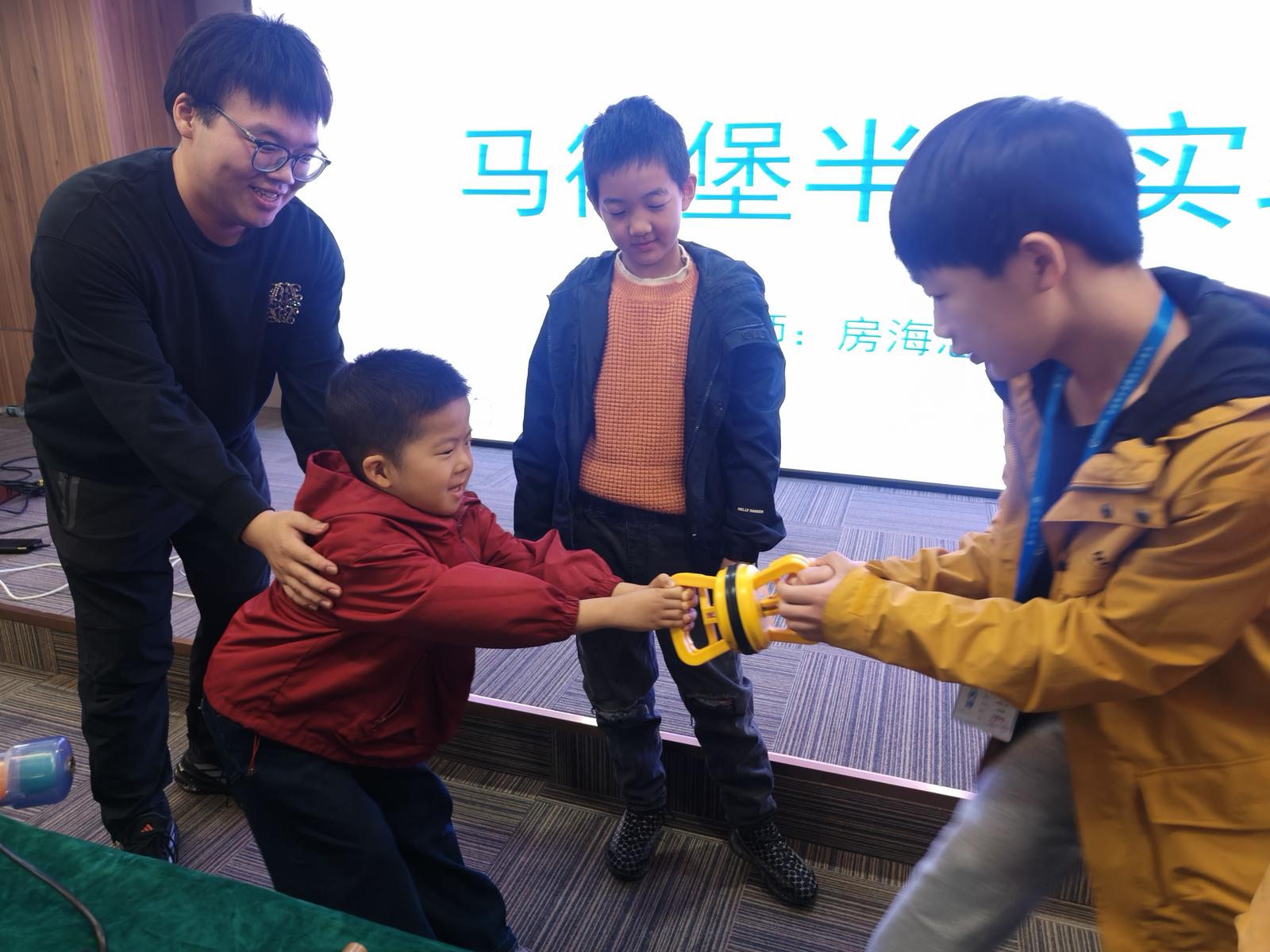乒乓球在气流上悬空跳舞、自行车轮旋转保持不倒、右侧音叉被敲响引起左侧震颤……现场,一个又一个奇趣实验接连上演,教室里惊叹声、欢笑声此起彼伏。在“马德堡半球实验”中,两名小记者自告奋勇,朝相反方向拉扯合拢的半球,小脸憋得通红可是球却纹丝不动。“不是你们力气太小,而是大气压的力量太强大啦!”志愿者笑着揭秘,“就像我们平时用吸管喝饮料,其实是大气压把饮料‘压’进了嘴里。”一名小记者恍然大悟:“原来我们每天都在用物理知识喝水呀!”