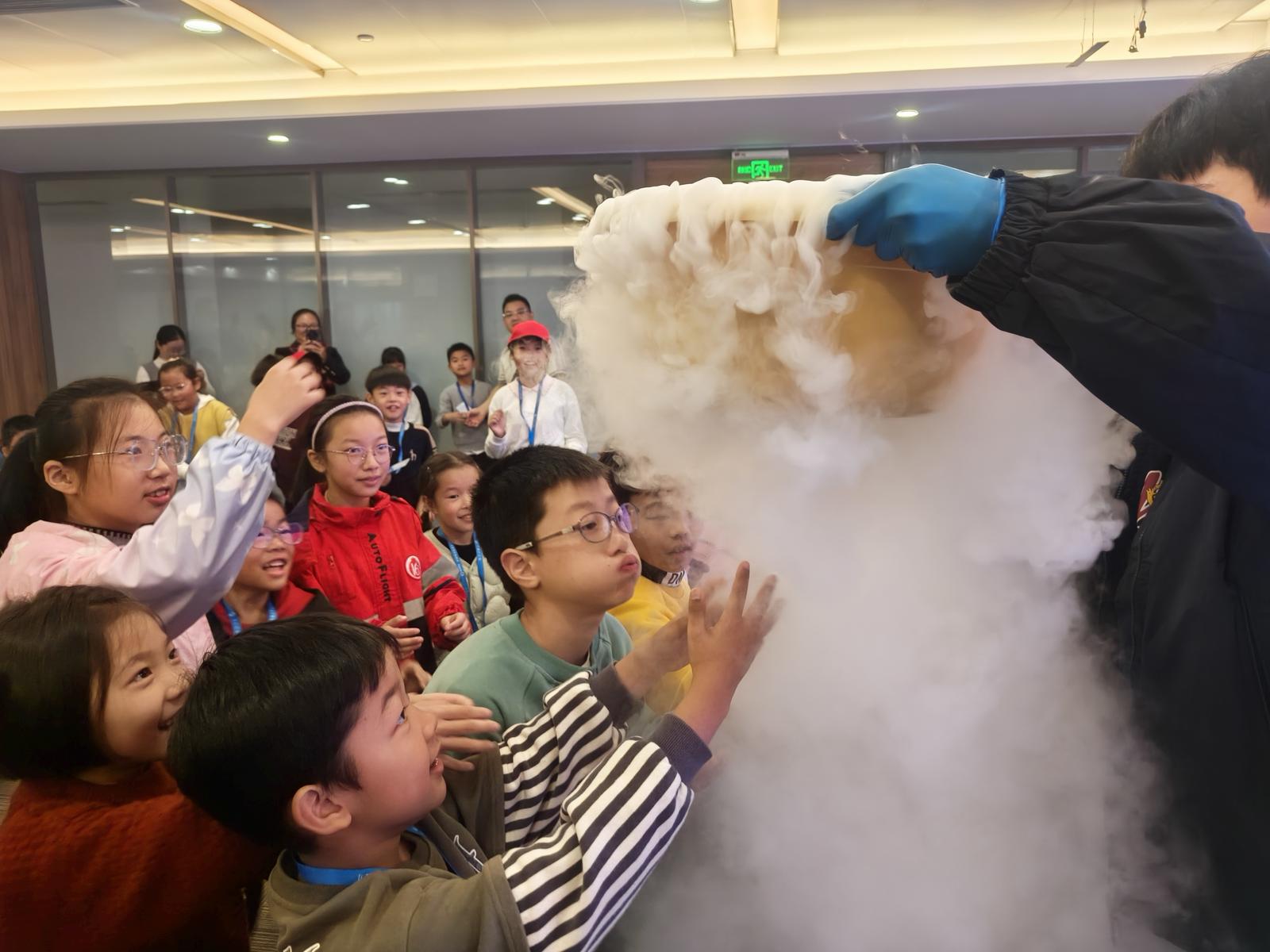 压轴登场的“仙雾秘境实验”,让整个教室变成了欢乐的海洋。志愿者将预先准备的干冰倒入盆中,再加入适量热水,一瞬间,白色云雾倾泻而出、奔涌四散。“这就是玉皇大帝的天庭呀!”小记者们齐声惊呼,“原来物理这么好玩!我以后也想当科学家,创造更多更酷的实验!”