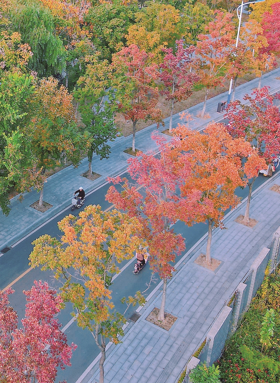 11月5日,如皋市外城河边的影梅路两侧,乌桕树五色斑斓,成为深秋时节城市街头一道亮丽的风景线。市民骑行其间,犹在画中游。 吴树建