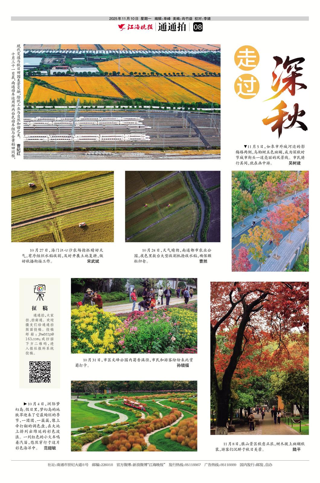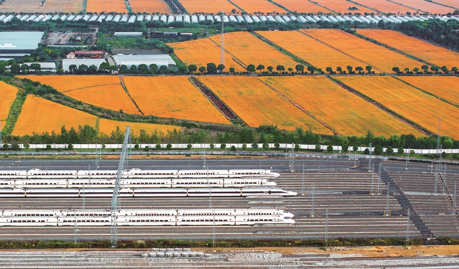 10月31日晨,南通动车运用所内白色动车组与金黄稻田同框,现代交通与秋日田园美景交融,绘就工业与自然和谐之美。 曹纪红