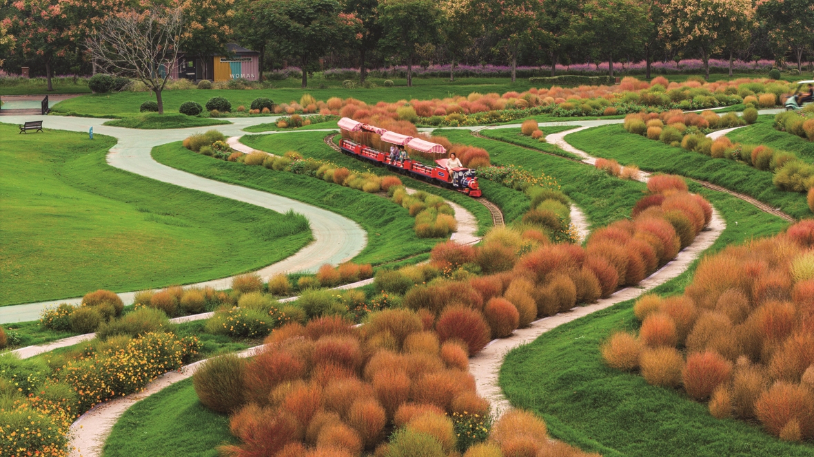 10月4日,洲际梦幻岛。假日里,梦幻岛的地肤草迎来了它最绚烂的季节,一团团、一簇簇,像上帝打翻的调色盘,在大地上排列出绵延的彩色波浪。一列红色的小火车鸣着汽笛,悠然穿行于这片彩色海洋中。 范鎧毓