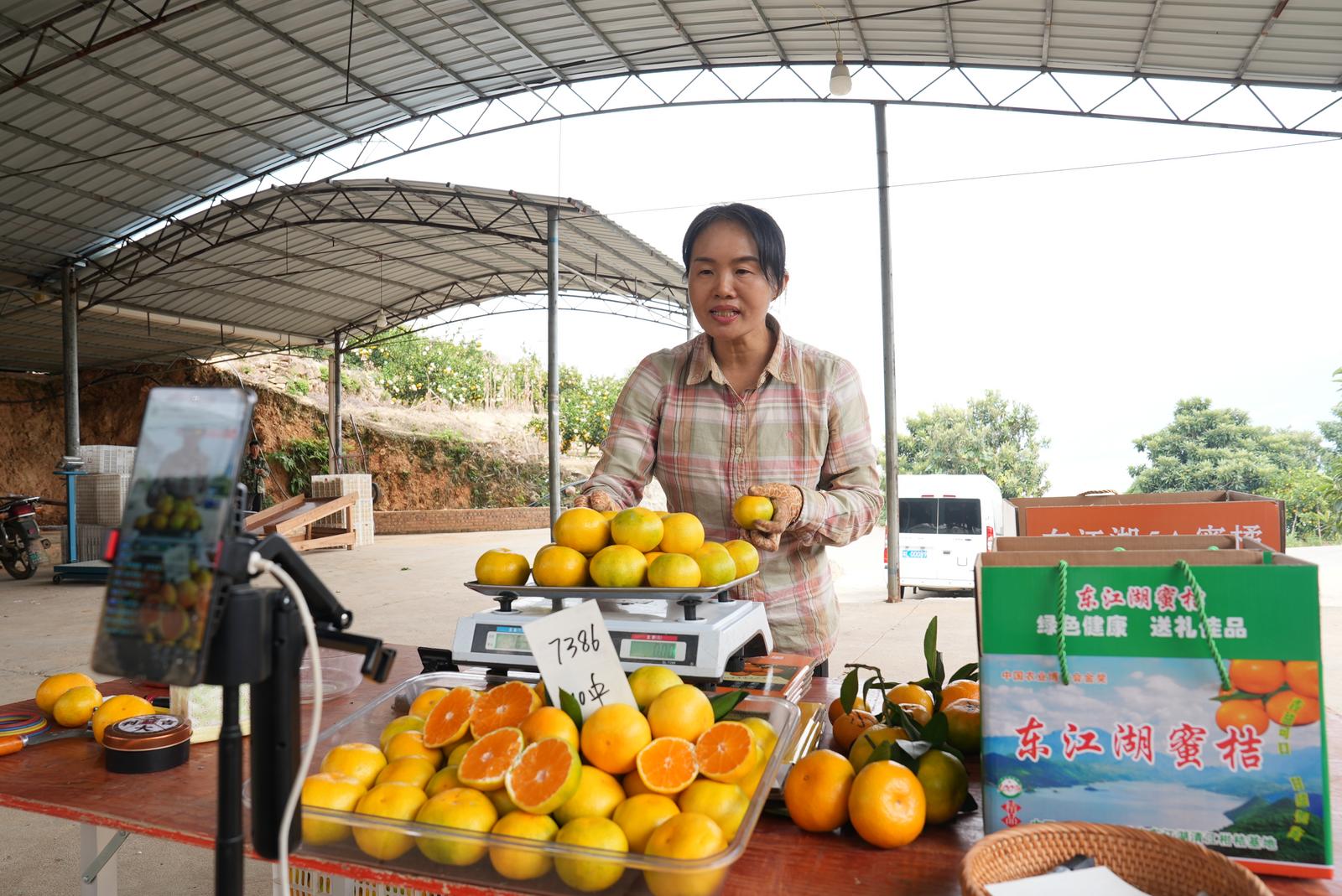 “家人们看过来,自家果园刚摘的东江湖蜜橘,皮薄肉嫩,汁水足!”来到刘丽的果园,她正在电商平台直播。