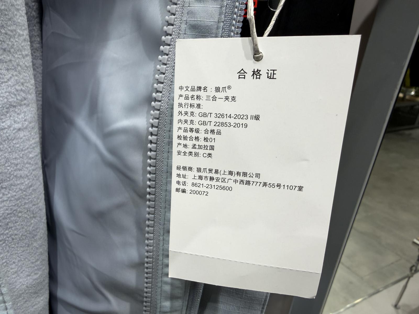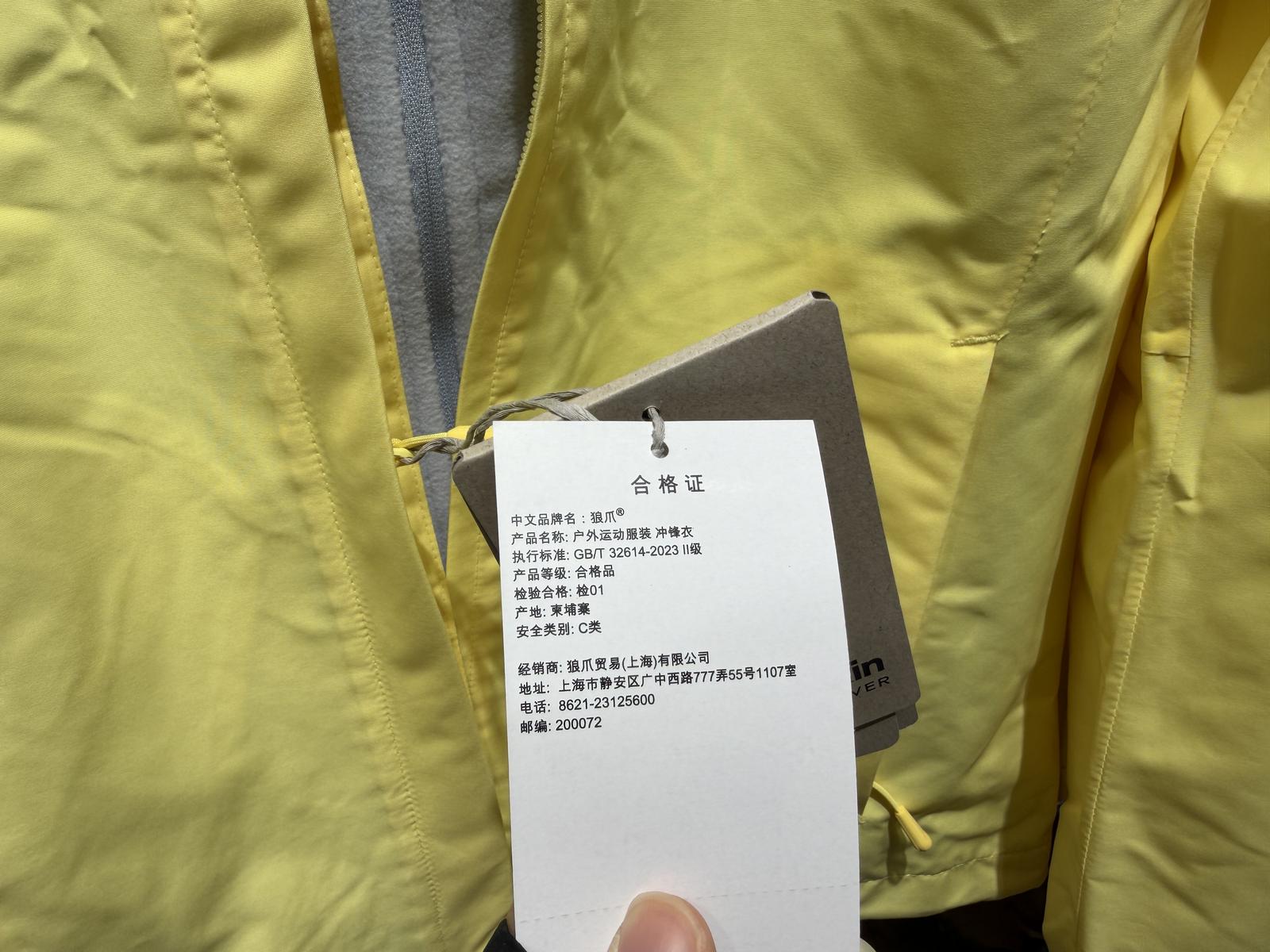 然而,这件衣服的吊牌信息显示其执行标准为“FZ/T 81007-2022”。记者查询后了解到,这是适用于以纺织机织物为主要面料生产的单、夹服装,并非冲锋衣国家标准。