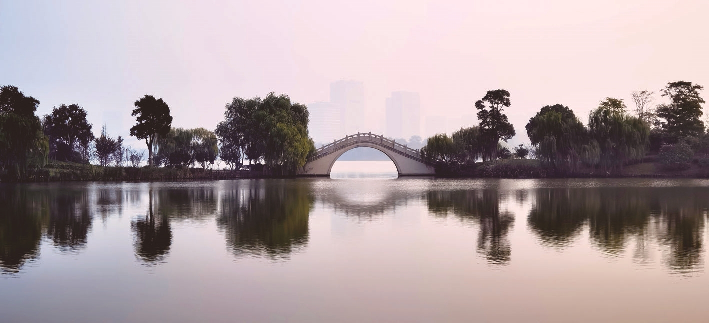 上车走了一会儿,想想还是不甘心,又来到了南侧的观湖景区。刚到湖边就发现这里别有一番意境。倒影中的湖中拱桥静默如画,偶有白鹭掠起,划破了清晨的静谧。于是兴奋地开启无人机进行拍摄。我甚至让无人机贴着水面从拱桥桥孔飞过。这是我第一次操作如此危险的动作。今天没拍到火烧云,但拍到了晨曦朦胧的紫琅湖,也算不枉起了个大早。