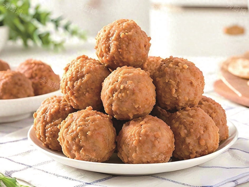 油锅烧得冒泡,左手抓一把肉糊轻轻一挤,圆润的肉团便从拇指与食指的缝隙间冒出来,右手持调羹一刮,肉团便呲溜滑进油里,瞬间鼓起金黄的外皮。此起彼伏的“滋啦”声里,肉香混着油香弥漫着厨房,半小时光景,小篮里便堆满了金灿灿的肉圆。