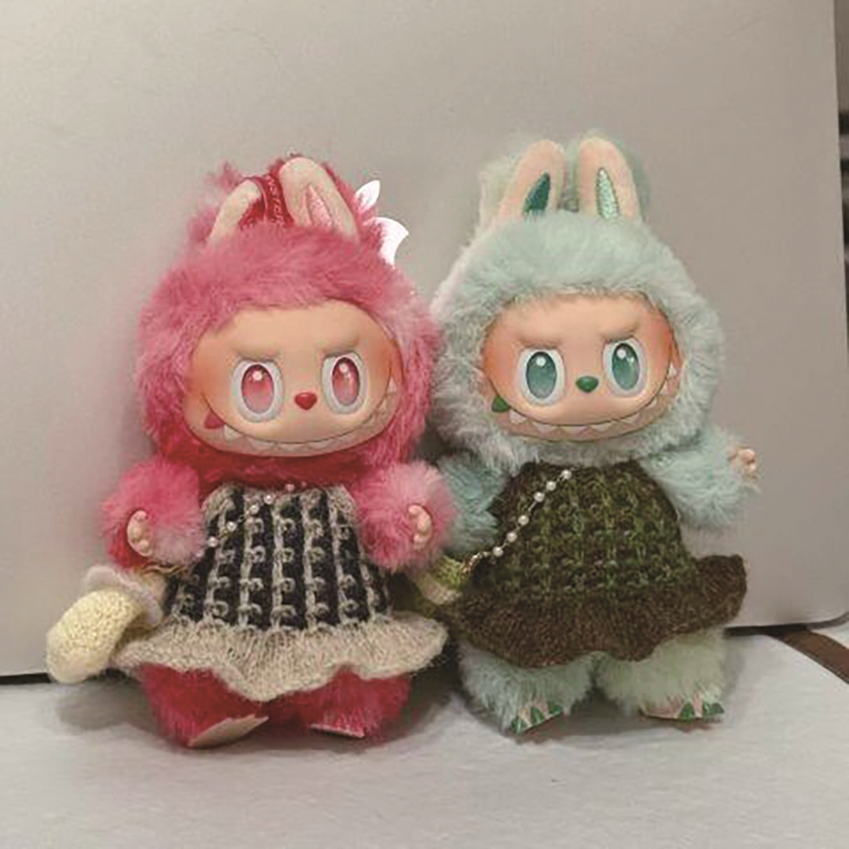 一件米白配藏蓝,一件军绿配黑棕,吊带裙的款式,最下方是飞扬的裙边,俏皮又灵动。最妙的是,老妈给每个玩偶都配了包包,还拆了一条我断舍离掉的项链做成了包链。我迫不及待地去给Labubu试穿,居然正好。