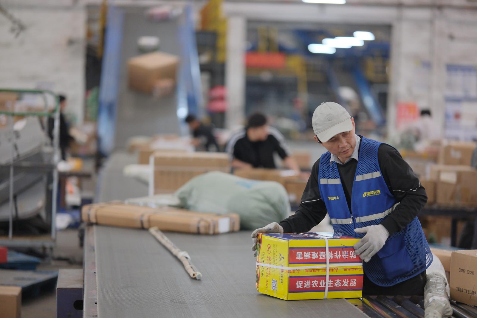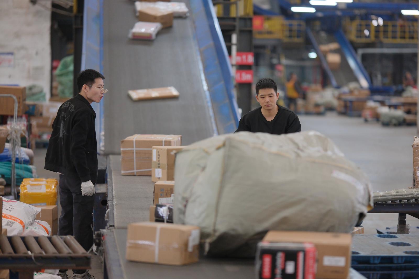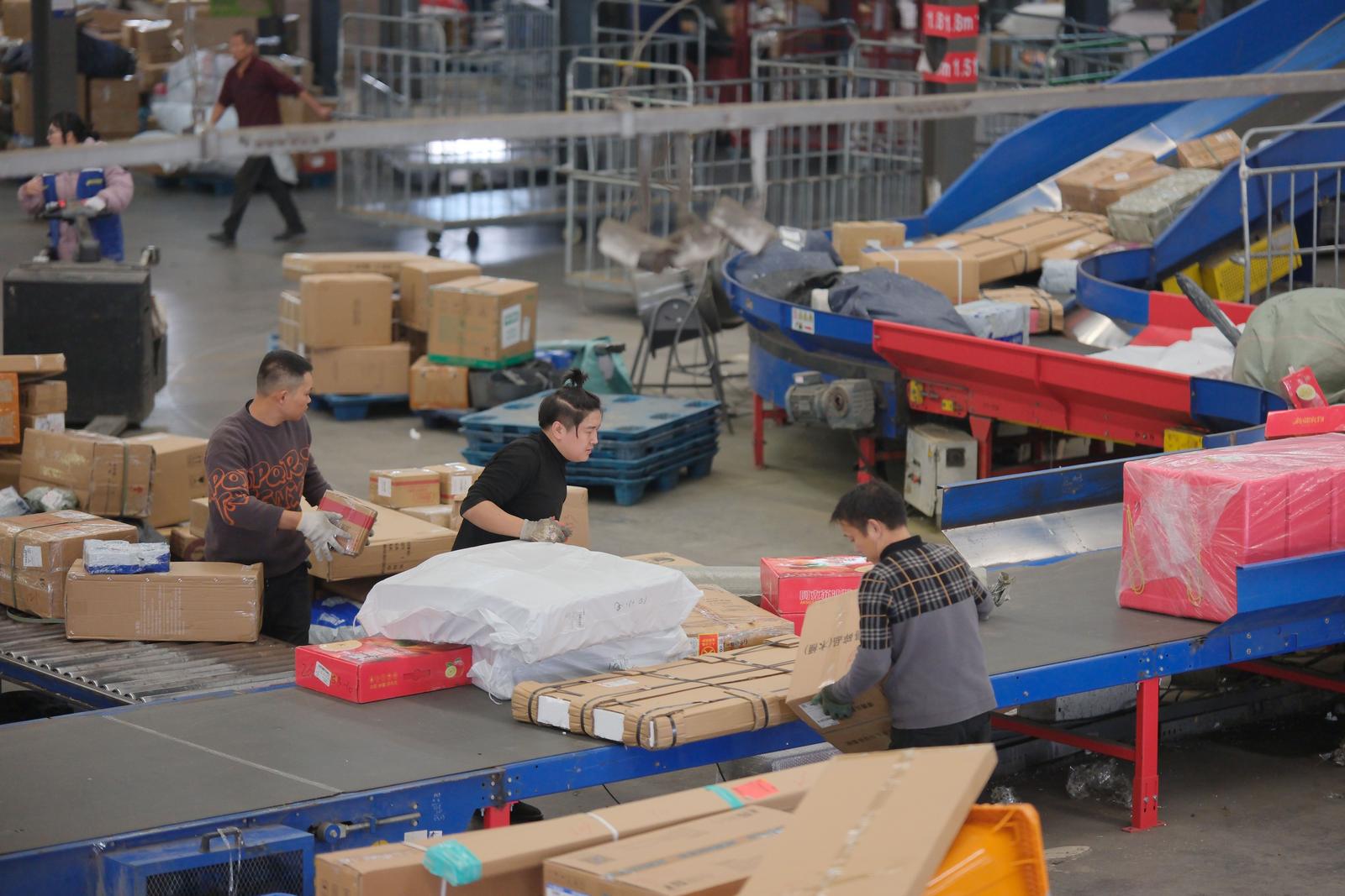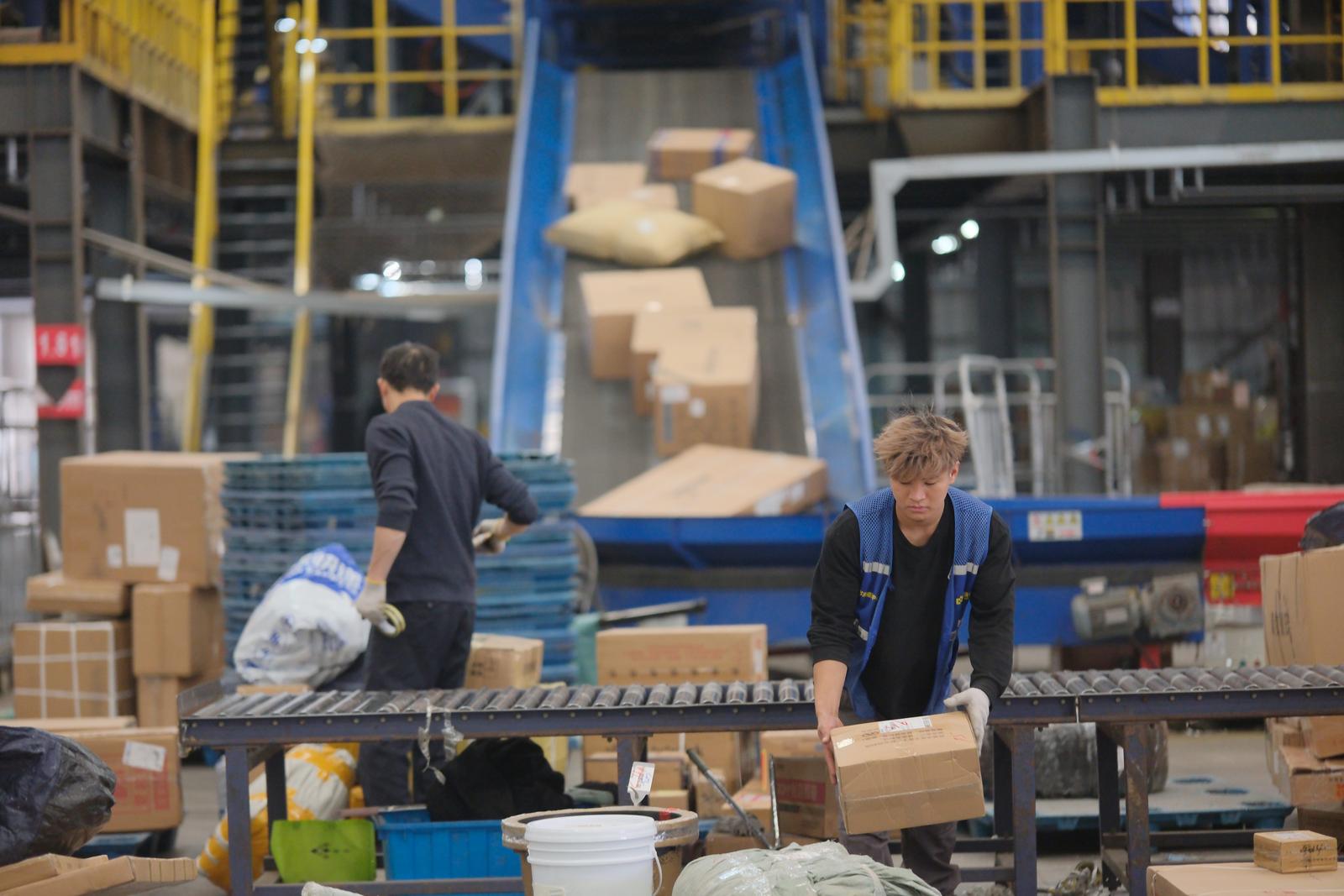 以上图片为11月12日,南通宝湾国际物流园内的一家快递企业员工正在分拣快件。