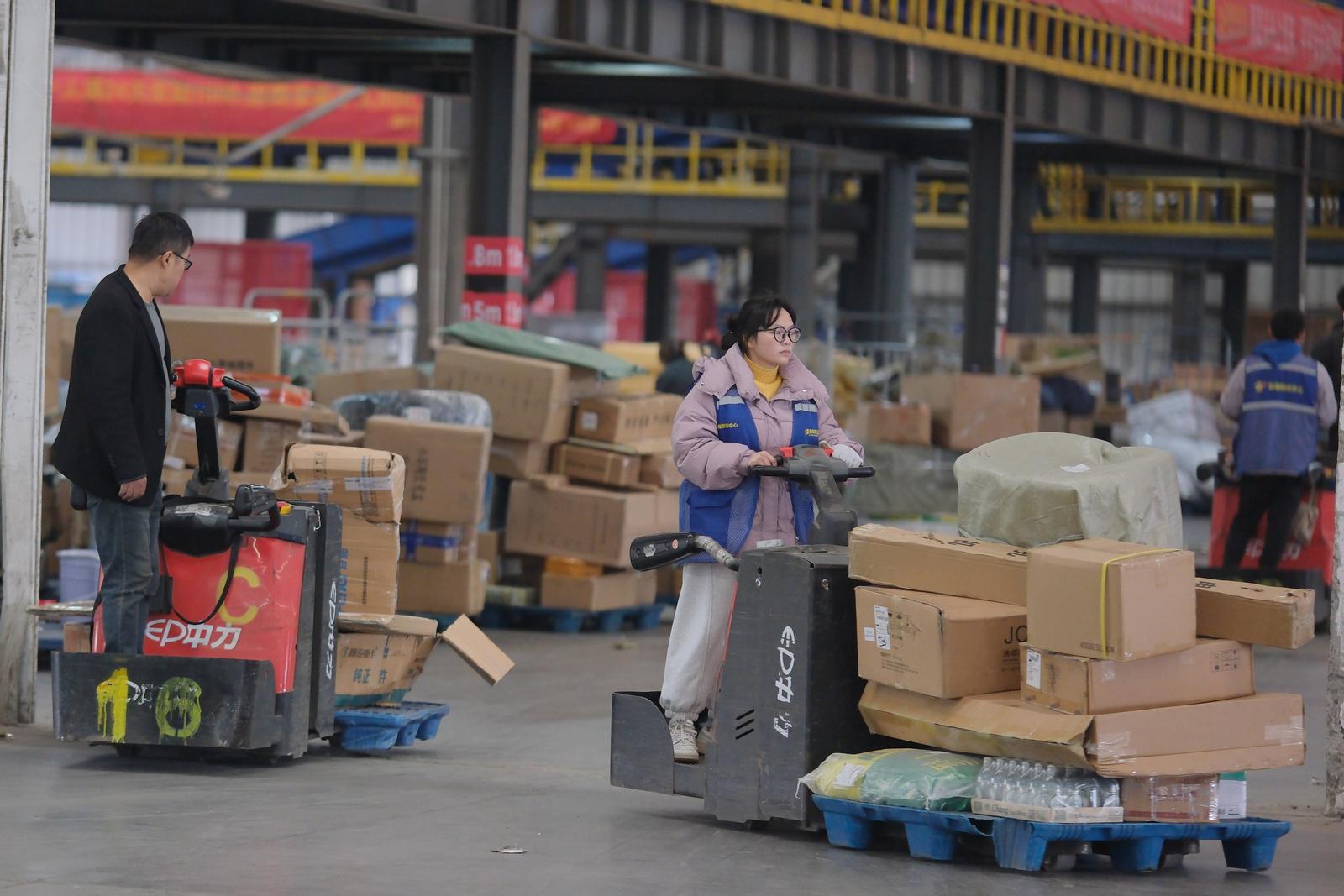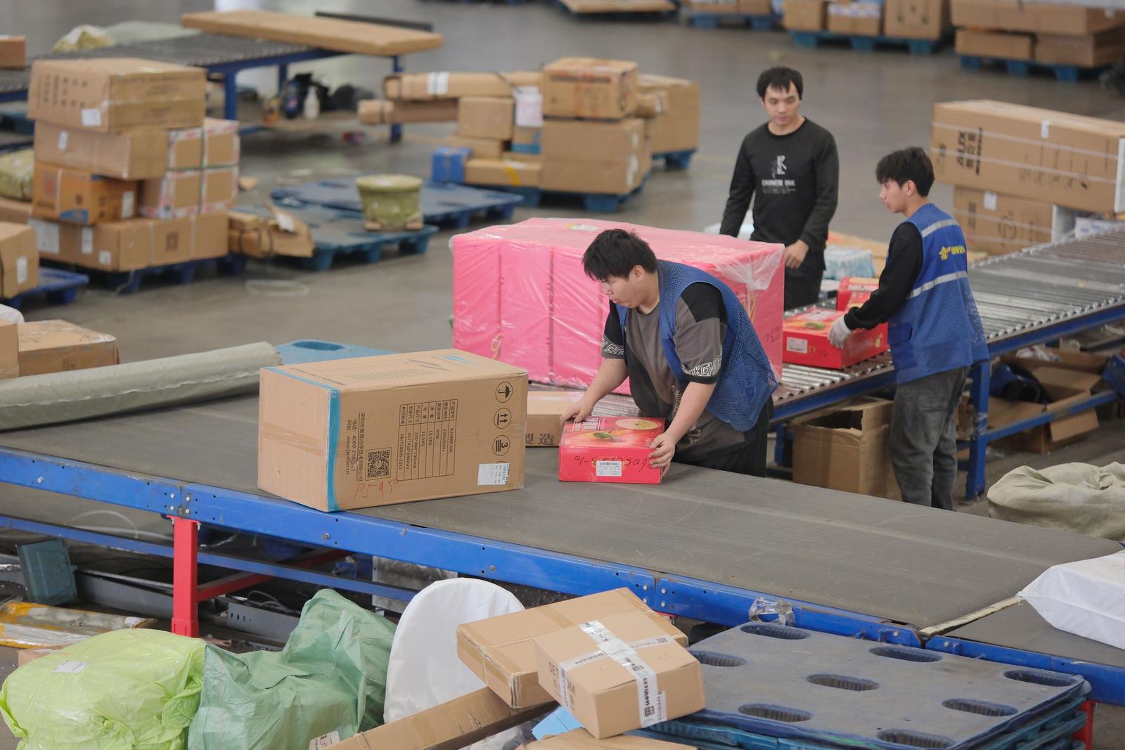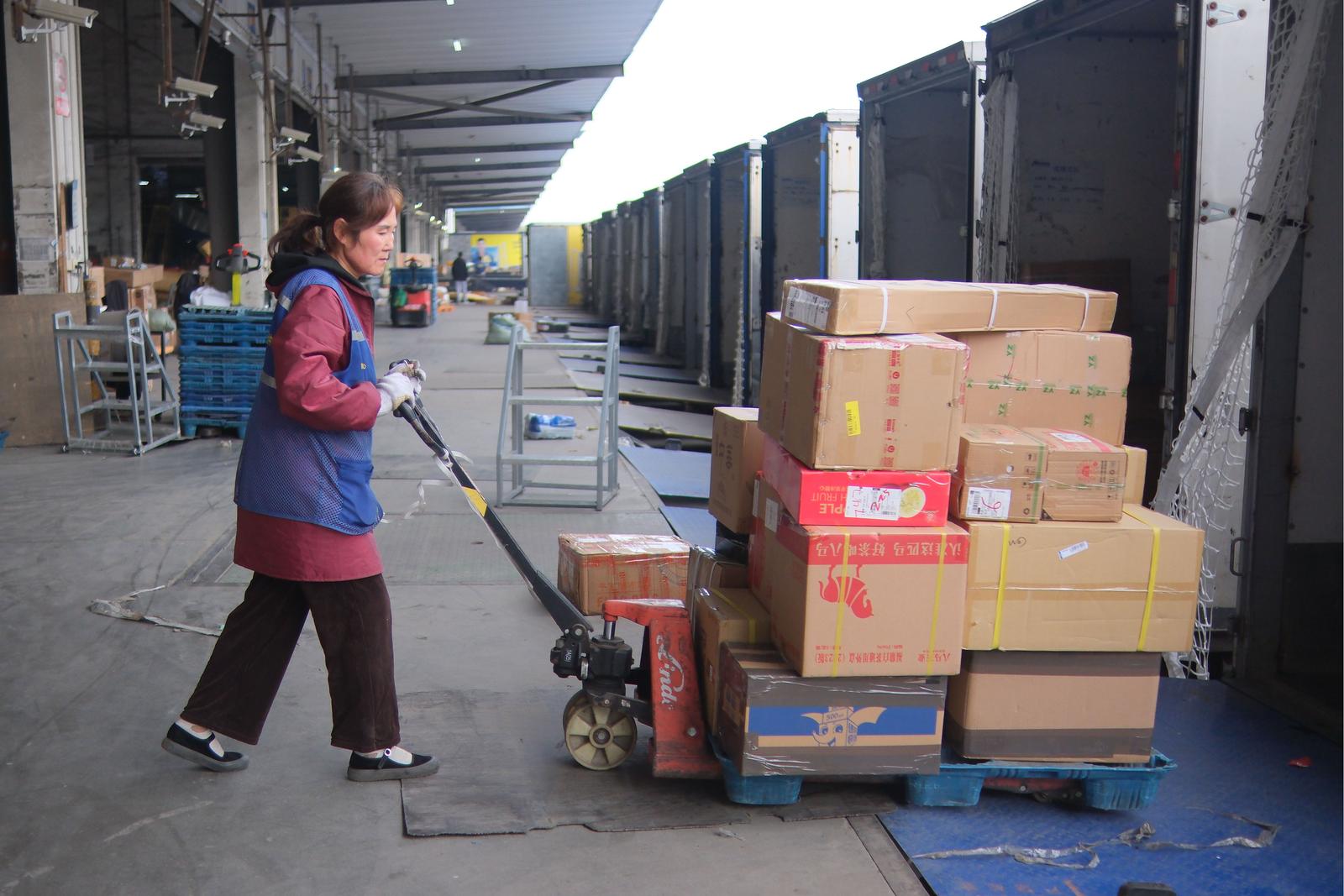 以上图片为11月12日,南通宝湾国际物流园内的一家快递企业员工正在分拣快件。