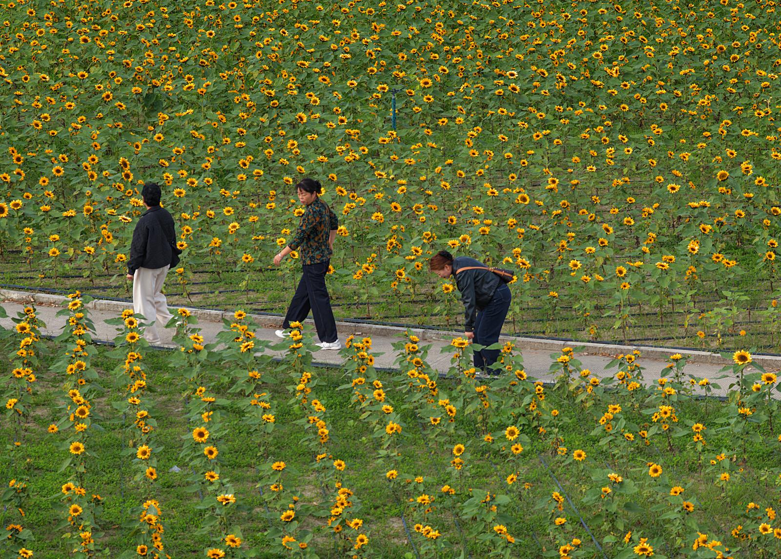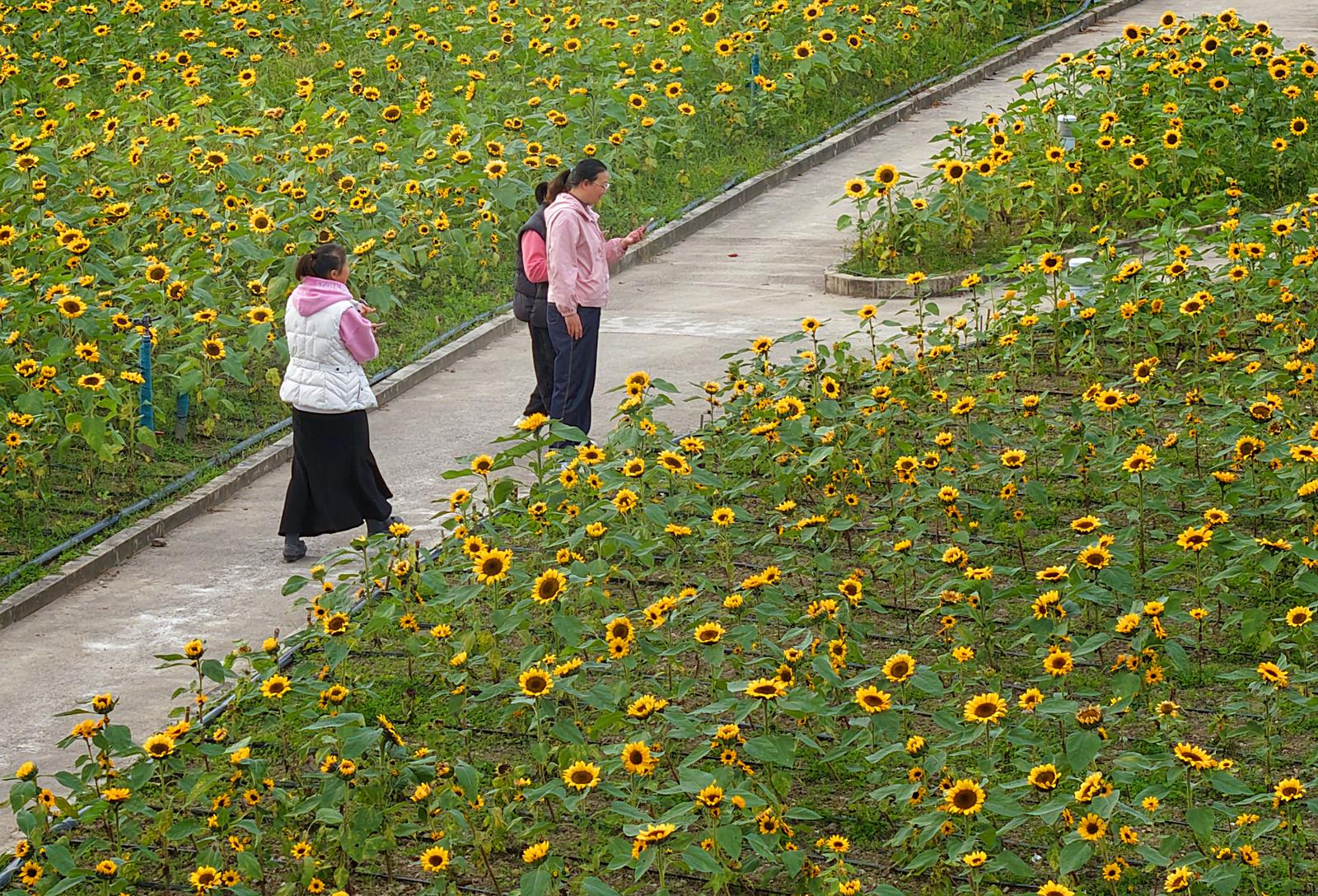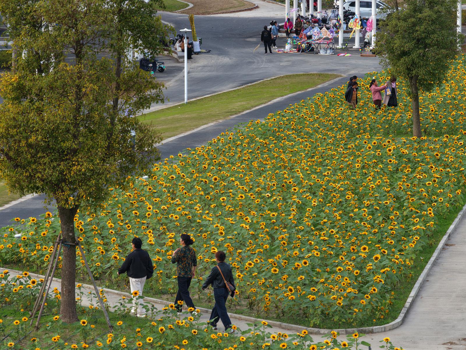 2025年11月12日,游客在崇川区滨江花海向日葵花丛中游览。眼下向日葵花陆续绽放,和粉黛乱子草相映成景,吸引了众多游客来到长江边畅游花海。